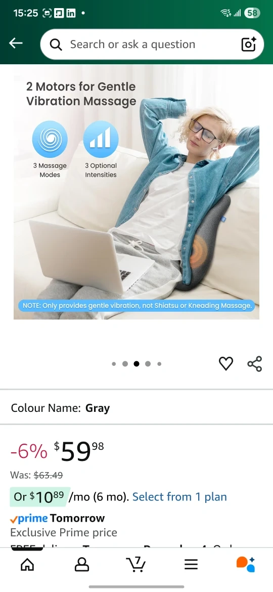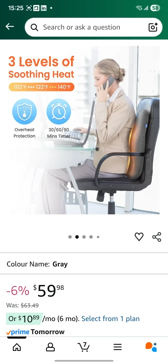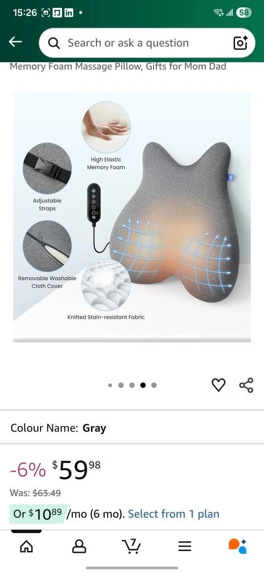I'm selling a CILI heated lumbar support pillow in gray! It's designed for office chairs and provides ergonomic back support with vibration and memory foam. It also has three levels of soothing heat, ranging from 102°F to 140°F, and an overheat protection feature, along with a 30/60/90 minute timer. Originally, it was bought for $59.98!
