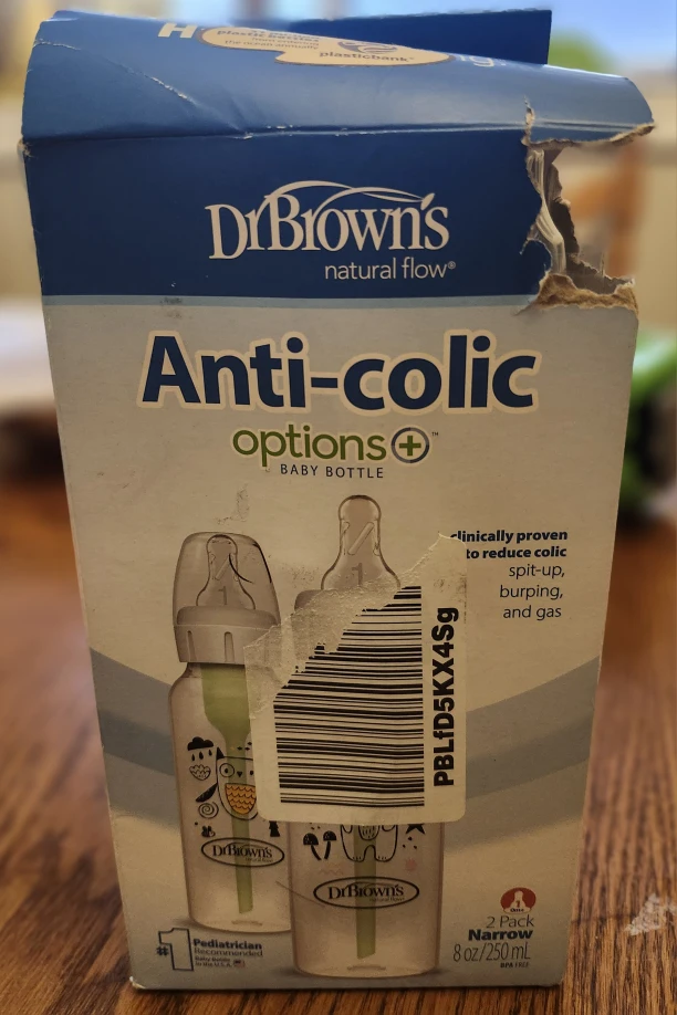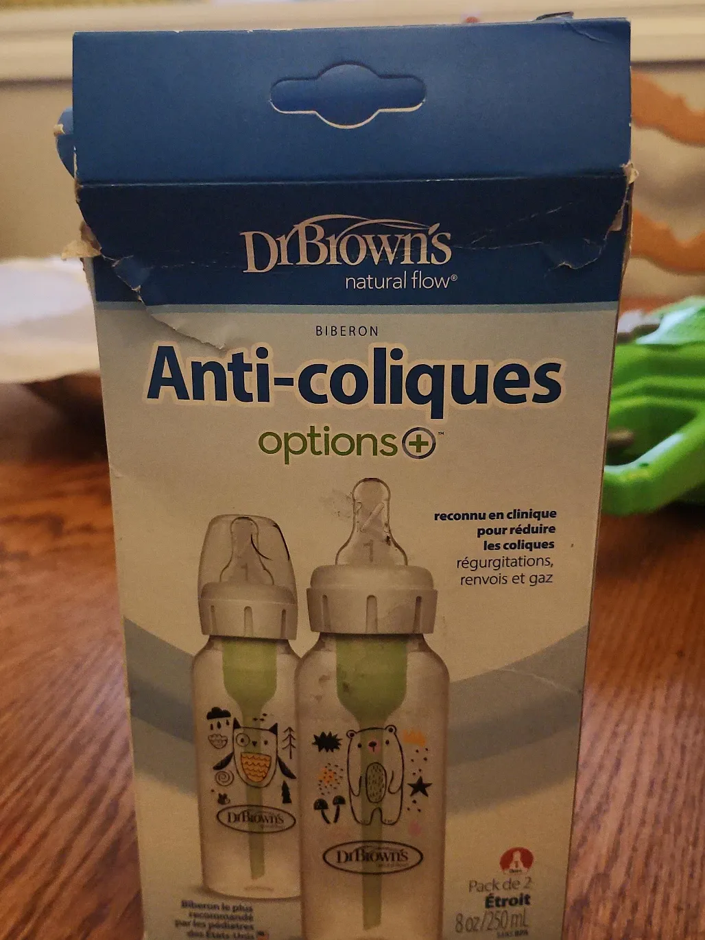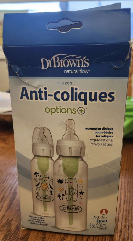 Selling a pack of two Dr. Brown's Natural Flow Anti-Colic Options+ baby bottles. Each bottle is 8oz/250ml. They are designed to help reduce colic, regurgitation, gas, and spit-up. The box is included!