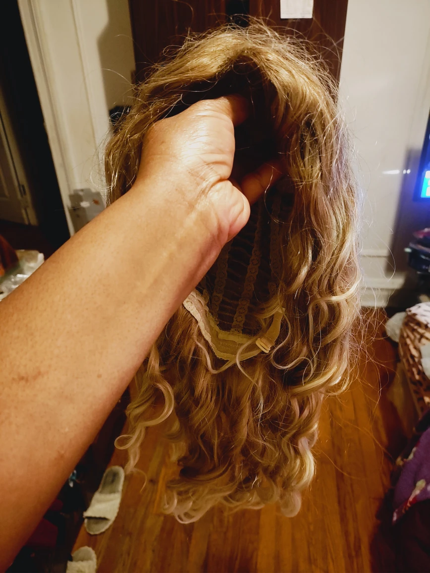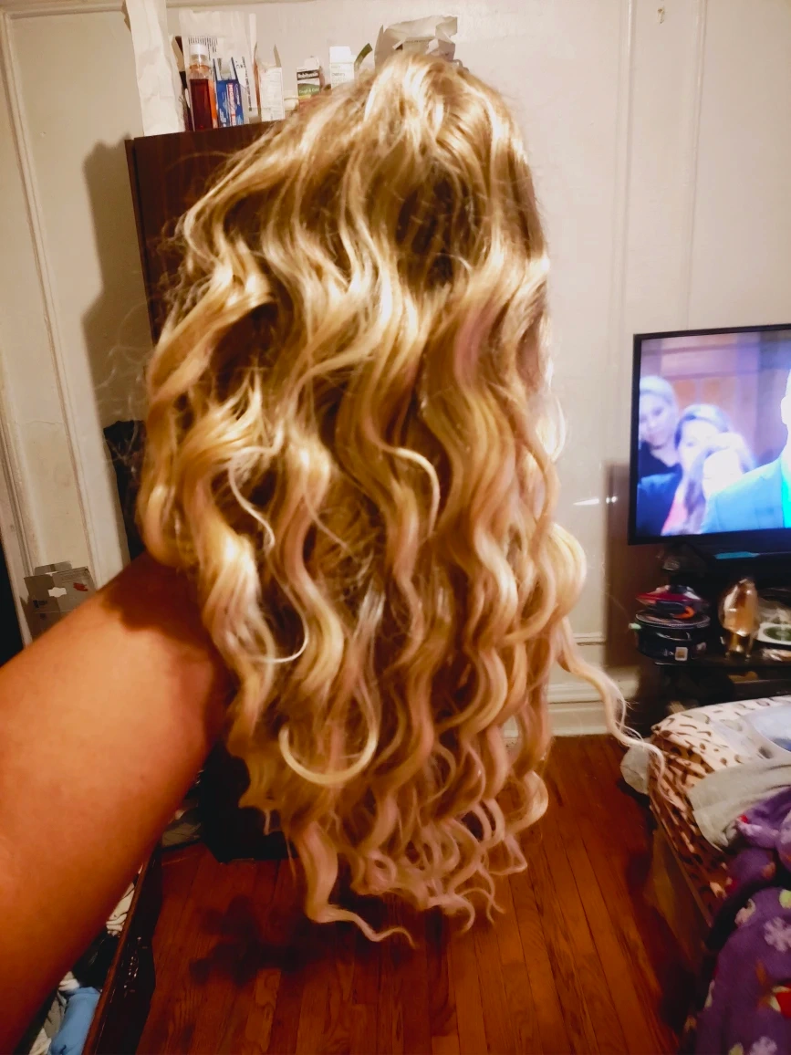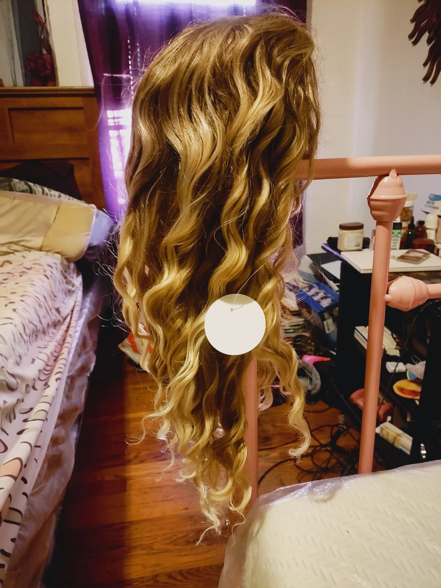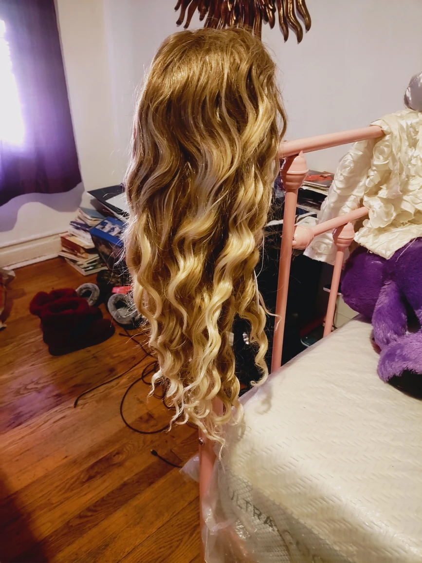 Selling a blonde curly wig. It has a beautiful wave pattern and appears to be in good condition. Perfect for changing up your look!