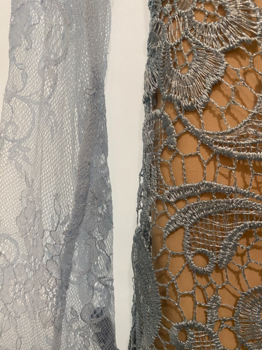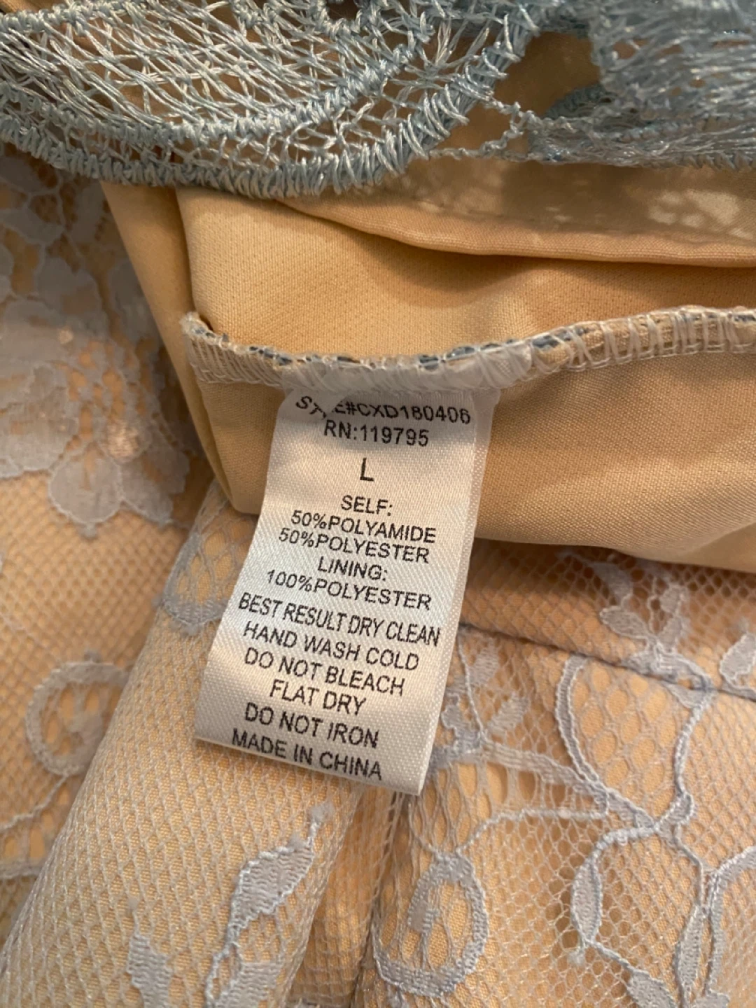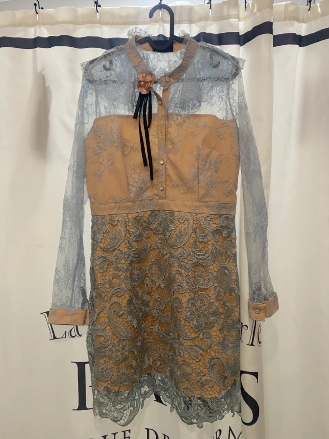 Beautiful lace dress with baby blue overlay and nude lining! The dress features a unique French Aleçon inspired lace top,an embroidered lace bottom, and a floral detailed pin with a black ribbon for a touch of Parisian elegance. Perfect for a special occasion!