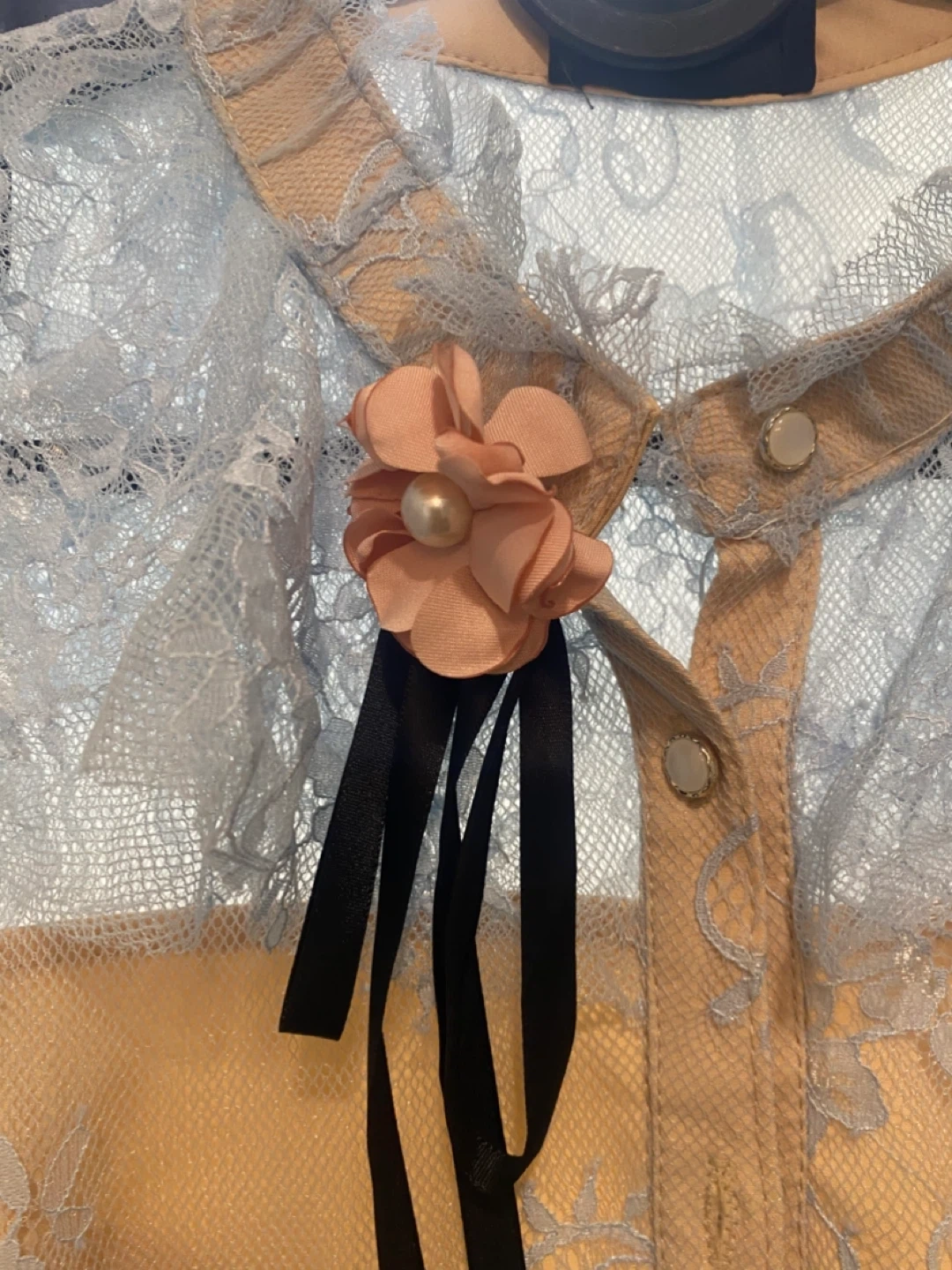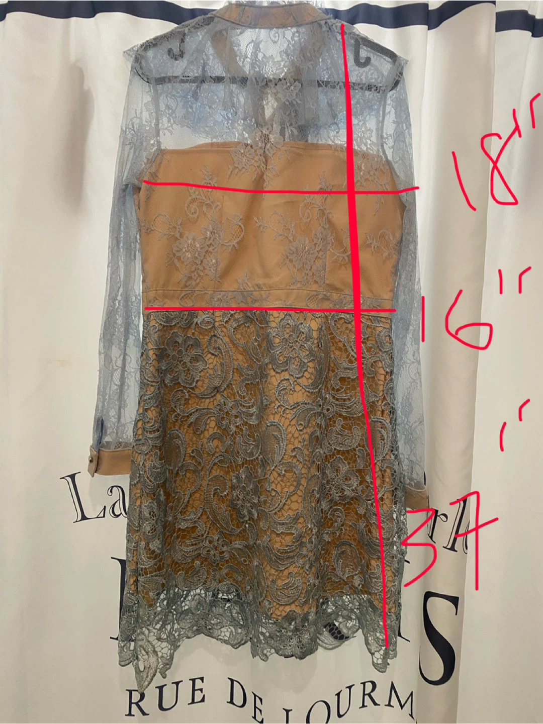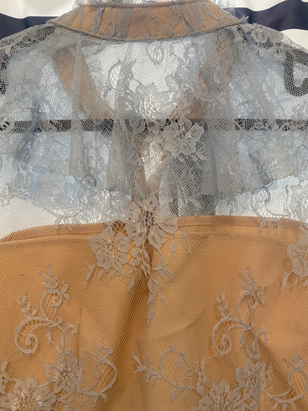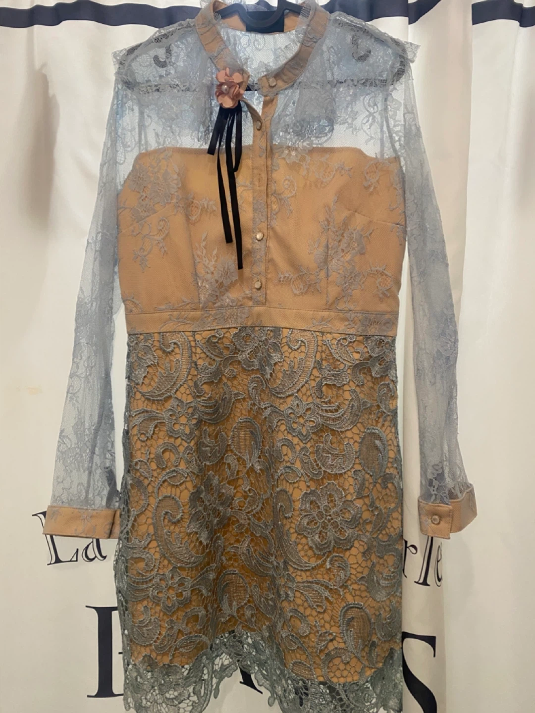 Beautiful lace dress with baby blue overlay and nude lining! The dress features a unique French Aleçon inspired lace top,an embroidered lace bottom, and a floral detailed pin with a black ribbon for a touch of Parisian elegance. Perfect for a special occasion!