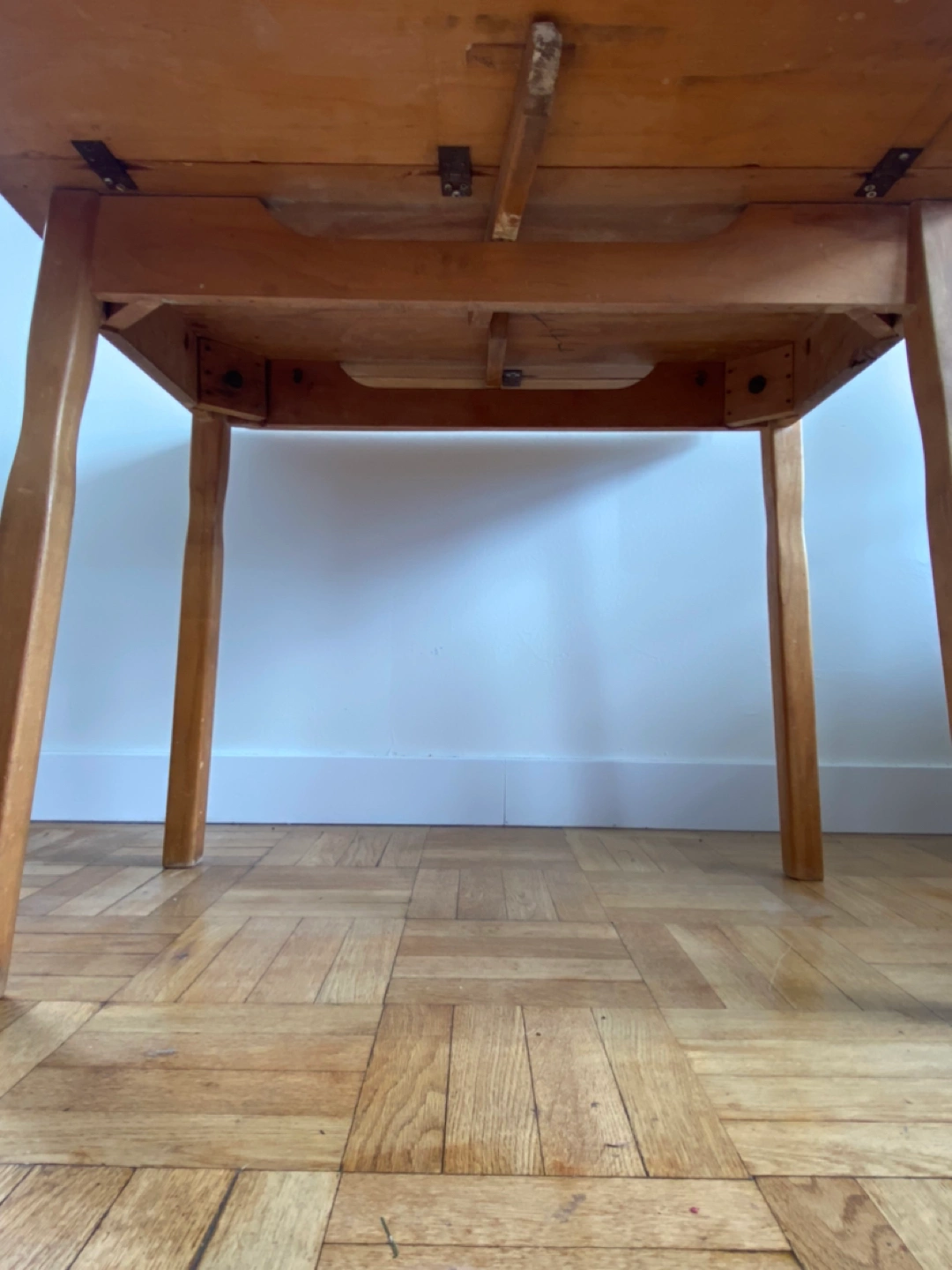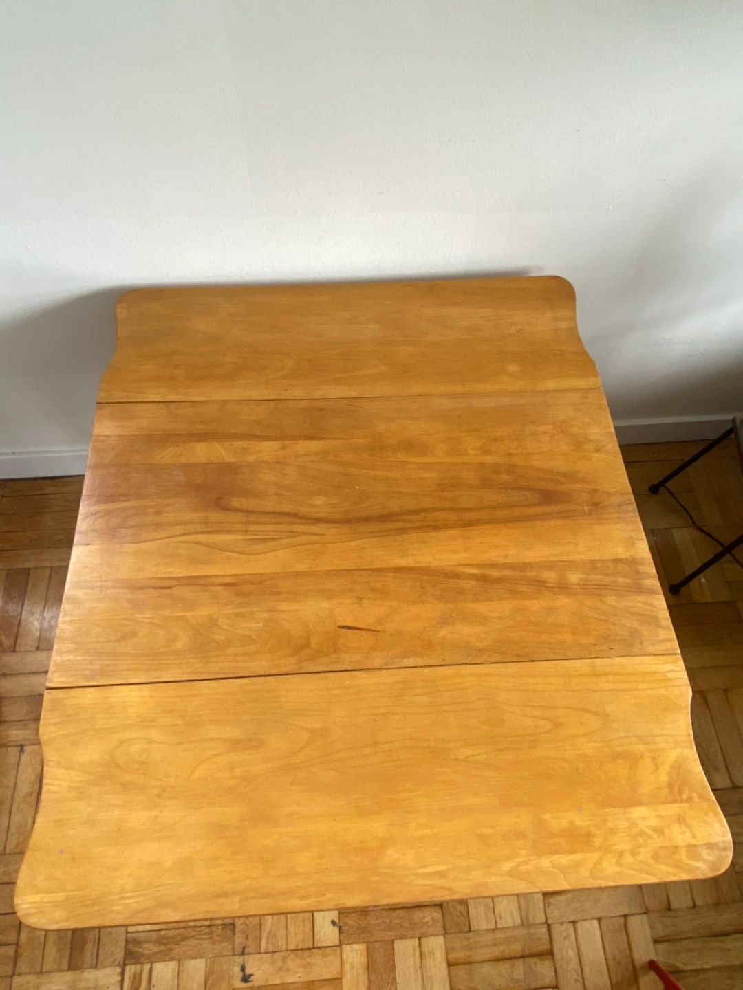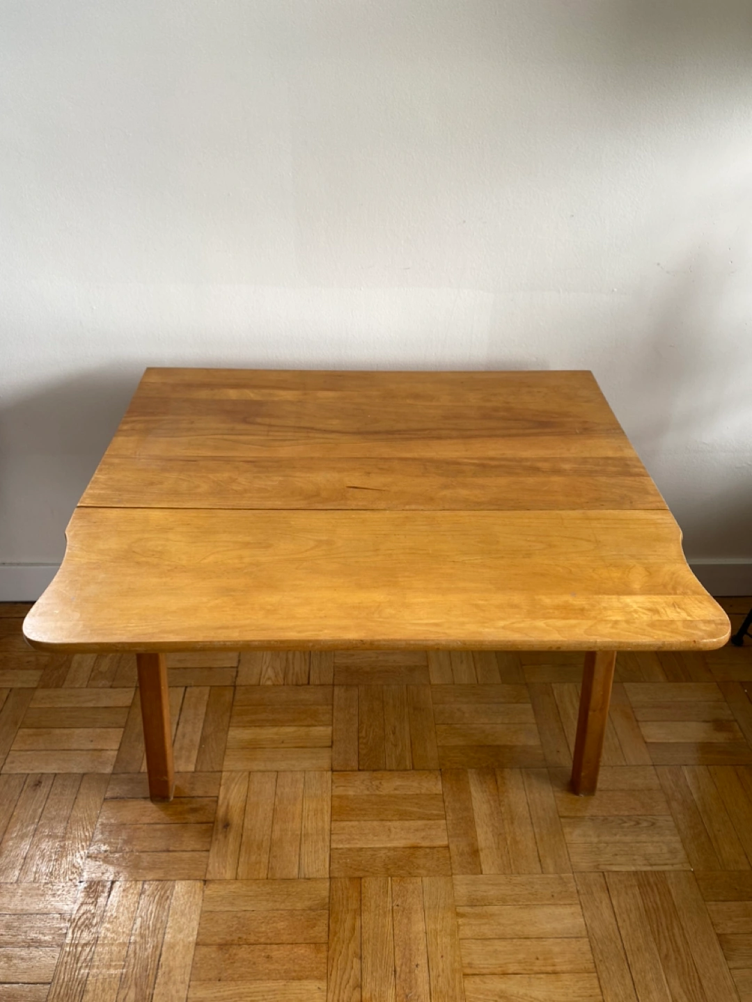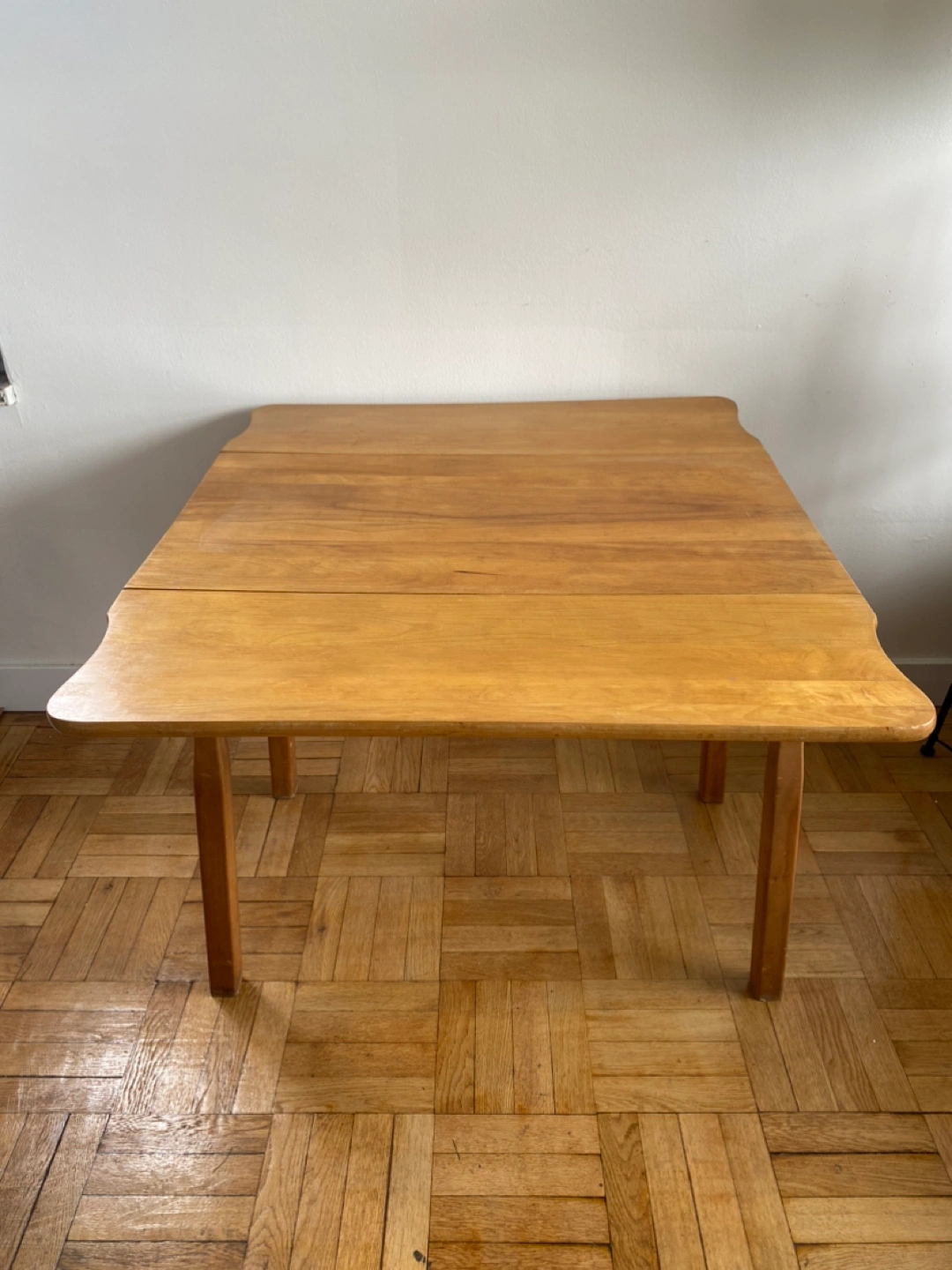 Solid wood, sturdy dining table with drop leaf sides. Light & warm stain, could be repainted or stained to cover small scratches. Was perfect for a small space to be closed when for single use and open when people come over. Moving so need to let it go unfortunately.