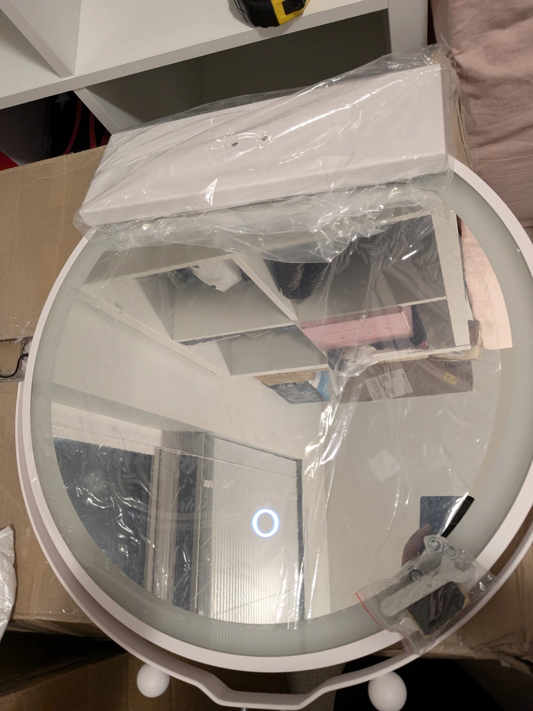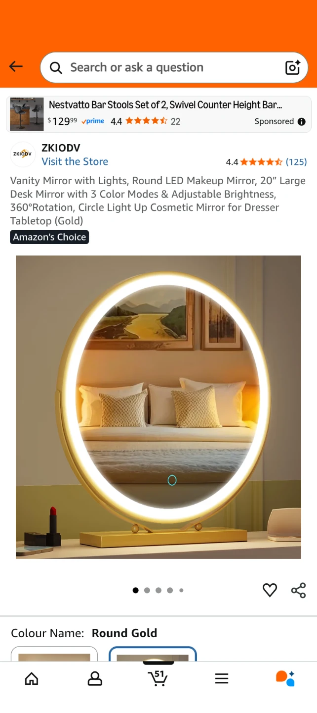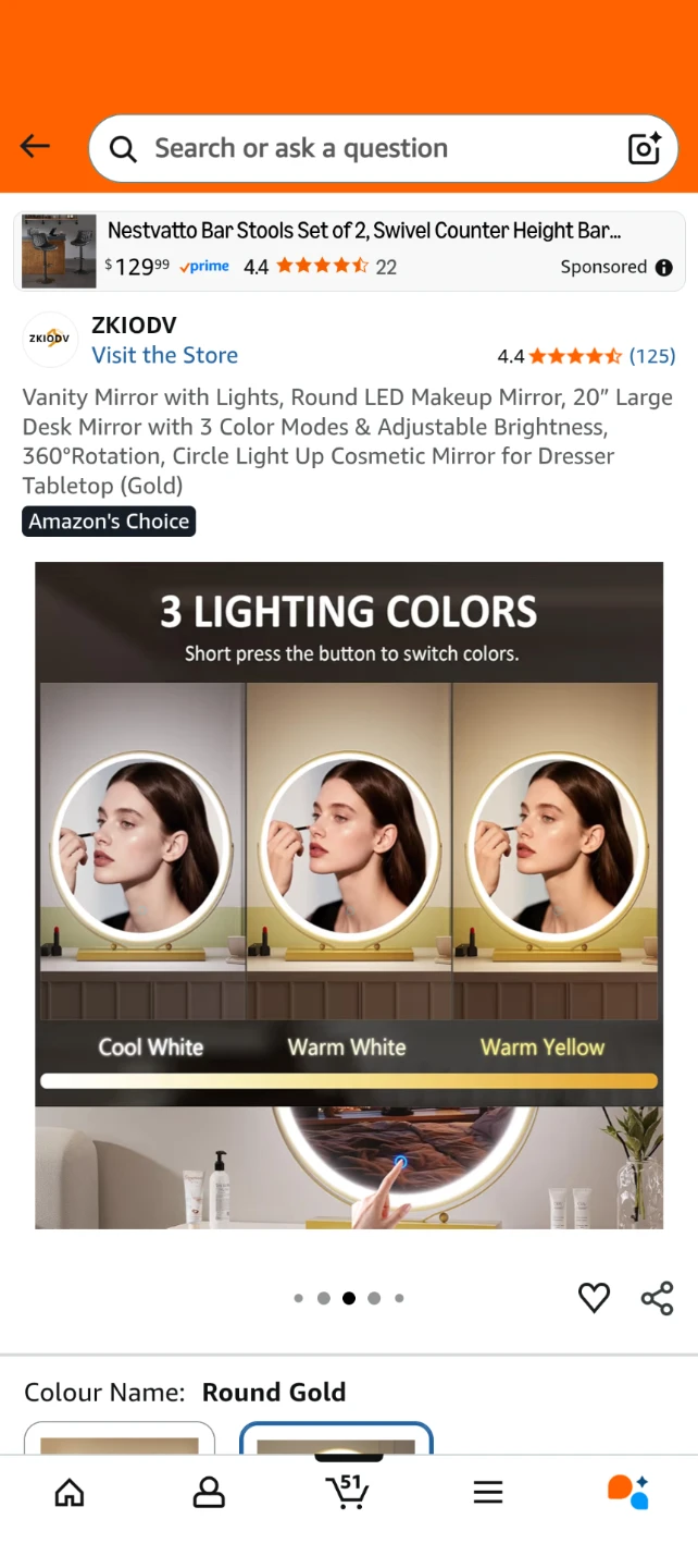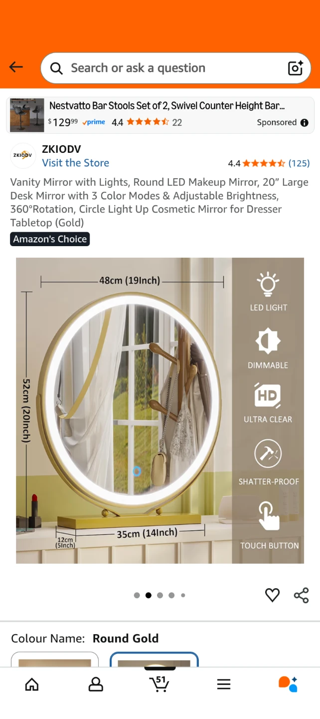 Selling a ZKIOV vanity mirror with lights in round gold! It's a 20" large desk mirror with 3 colour modes and adjustable brightness. It also features 360° rotation and a circle light up cosmetic mirror for dresser tabletops. Dimensions are 48cm (19inch) and 52cm (20inch).
