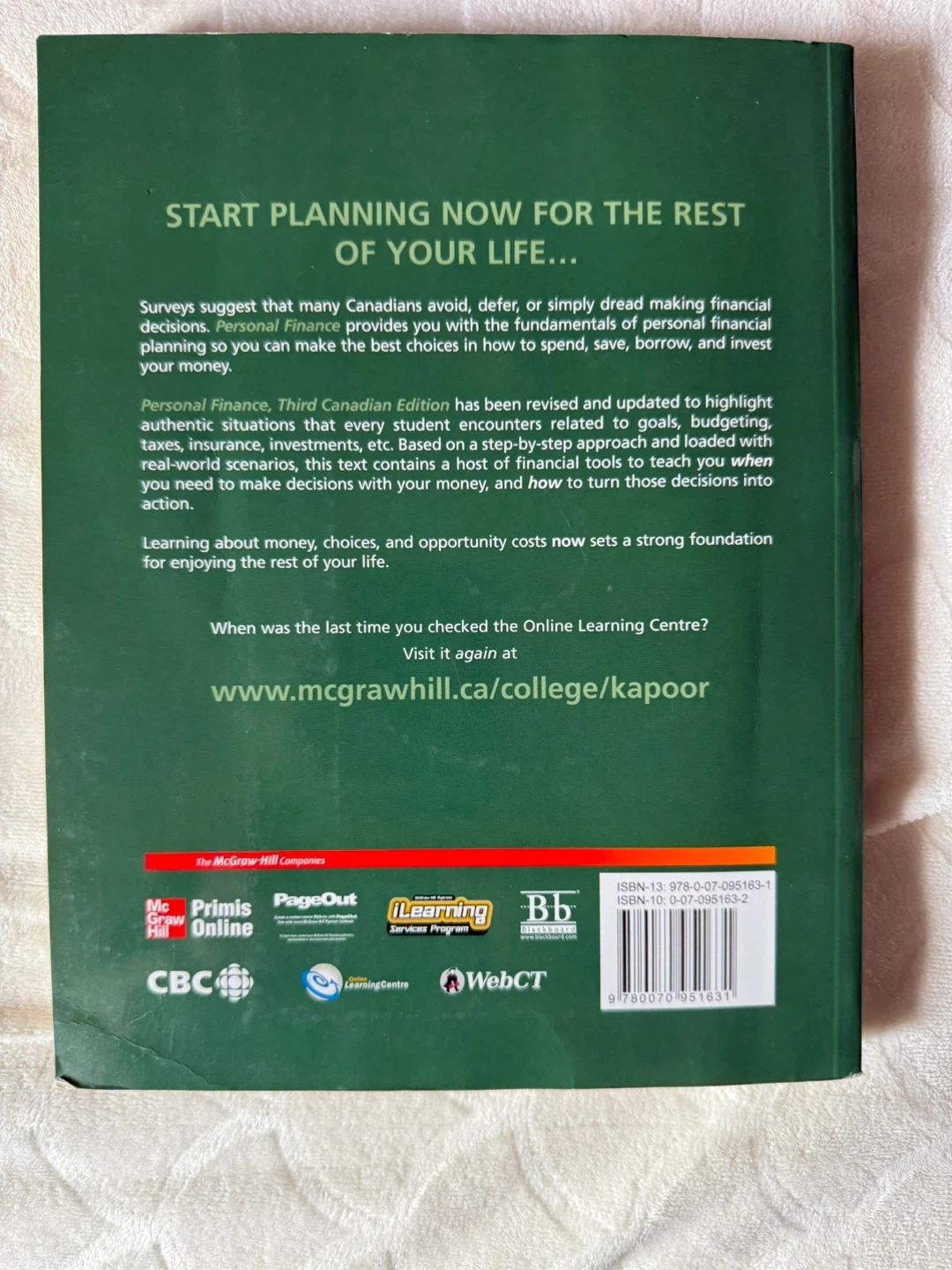 Selling a copy of Personal Finance, Third Canadian Edition by Kapoor, Dlabay, Hughes, and Ahmad. This book provides the fundamentals of personal financial decisions, covering how to spend, save, borrow, and invest your money. It includes updated scenarios related to goals, budgeting, taxes, insurance, and investments, with a step-by-step approach to making financial decisions.