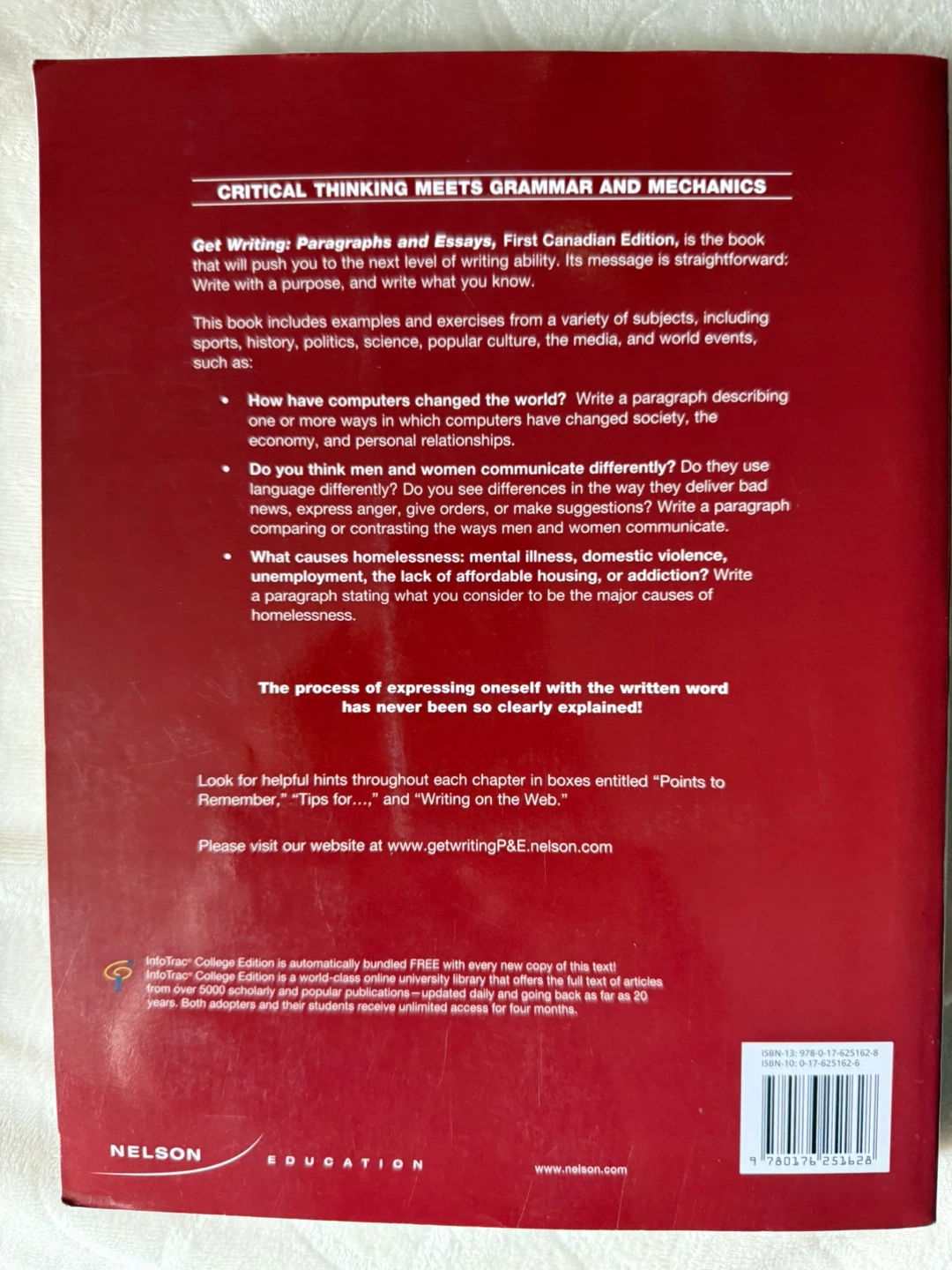 Selling "Get Writing: Paragraphs and Essays, First Canadian Edition" by Mark Connelly, Karen E. Hamilton, Heather McAfee, and Peter C. Miller. It's a great resource for improving your writing skills and understanding grammar and mechanics. Perfect for students or anyone looking to enhance their writing abilities!