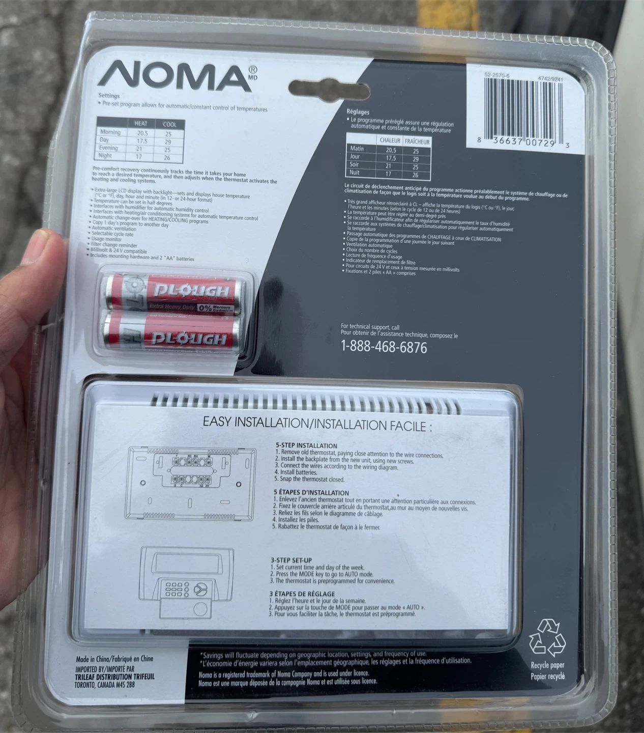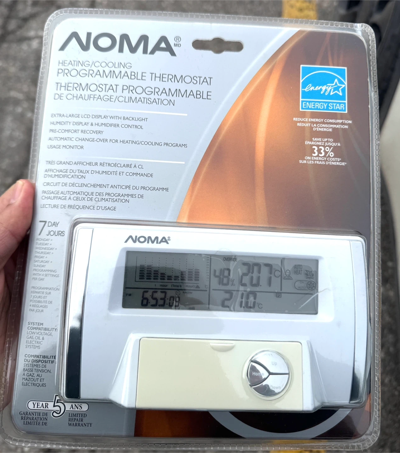 Selling a brand new Noma programmable thermostat still in its original packaging! It features an extra-large LCD display with backlight for easy viewing and humidity/dehumidifier control. It also has an automatic change-over for heating/cooling programs and a usage monitor. It's compatible with low voltage, electric, and gas systems.