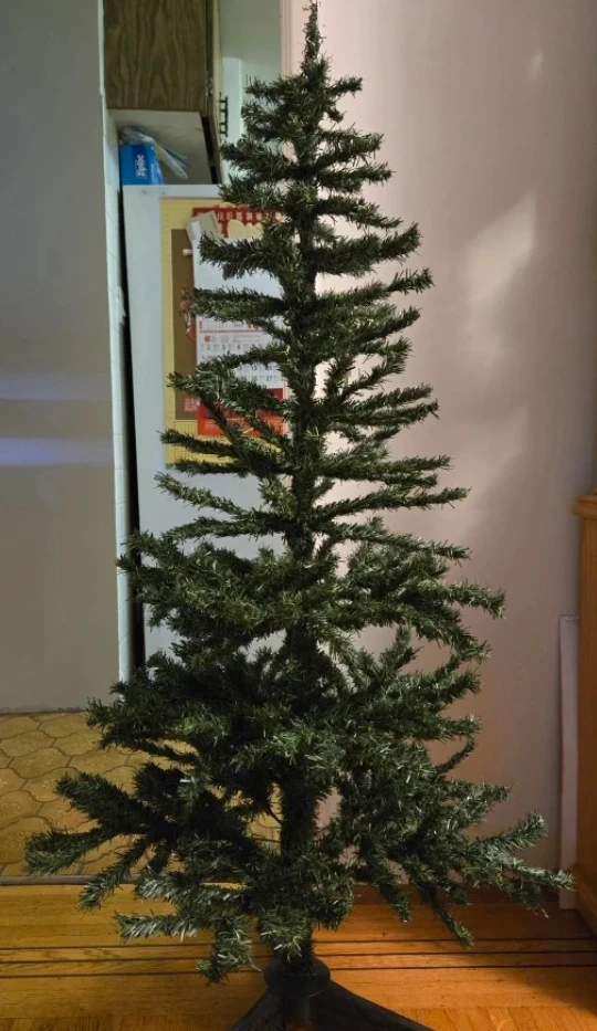 a used Christmas tree from last year perfect for the holidays! It comes with a star topper. The tree is in good condition and comes in its a box. Ornaments and hangers and lights are included. Around 5'1" tall. Selling as we don't celebrate Christmas