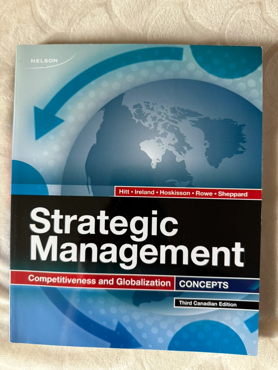 Selling a copy of "Strategic Management: Competitiveness and Globalization, Concepts, Third Canadian Edition" by Hitt, Ireland, Hoskisson, Rowe, and Sheppard. It combines authoritative research with contemporary examples from Canada and the world. Perfect for understanding strategic management in the 21st century!