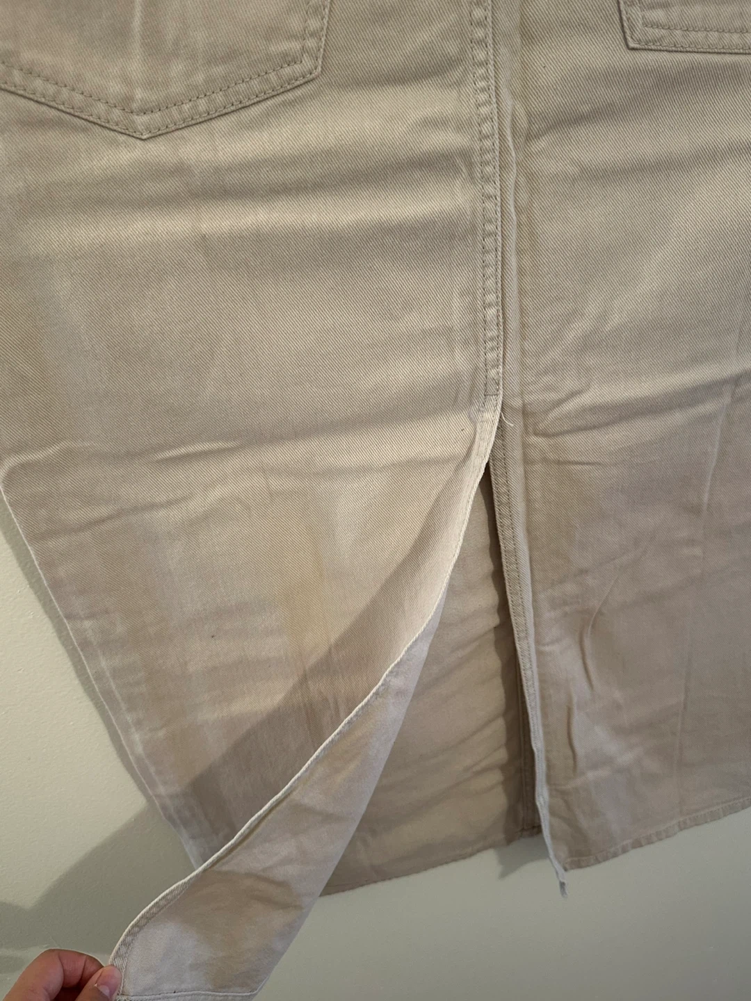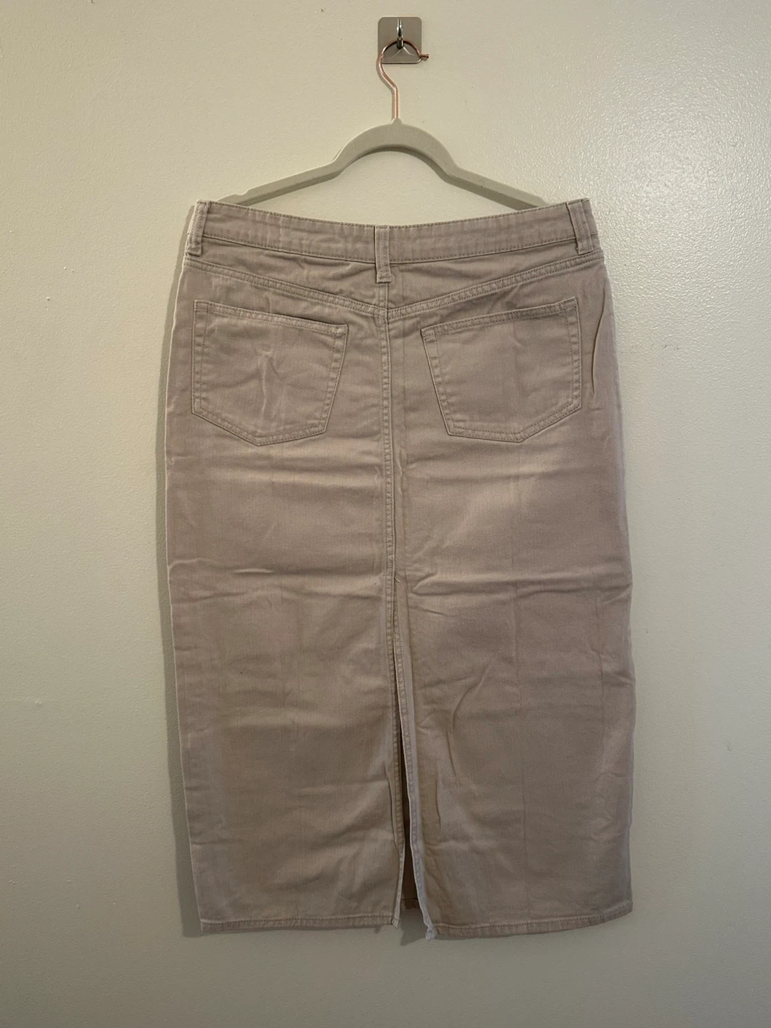 Selling a gently used H&M beige denim skirt in size US 10. The material is 100% cotton, making it super comfortable!