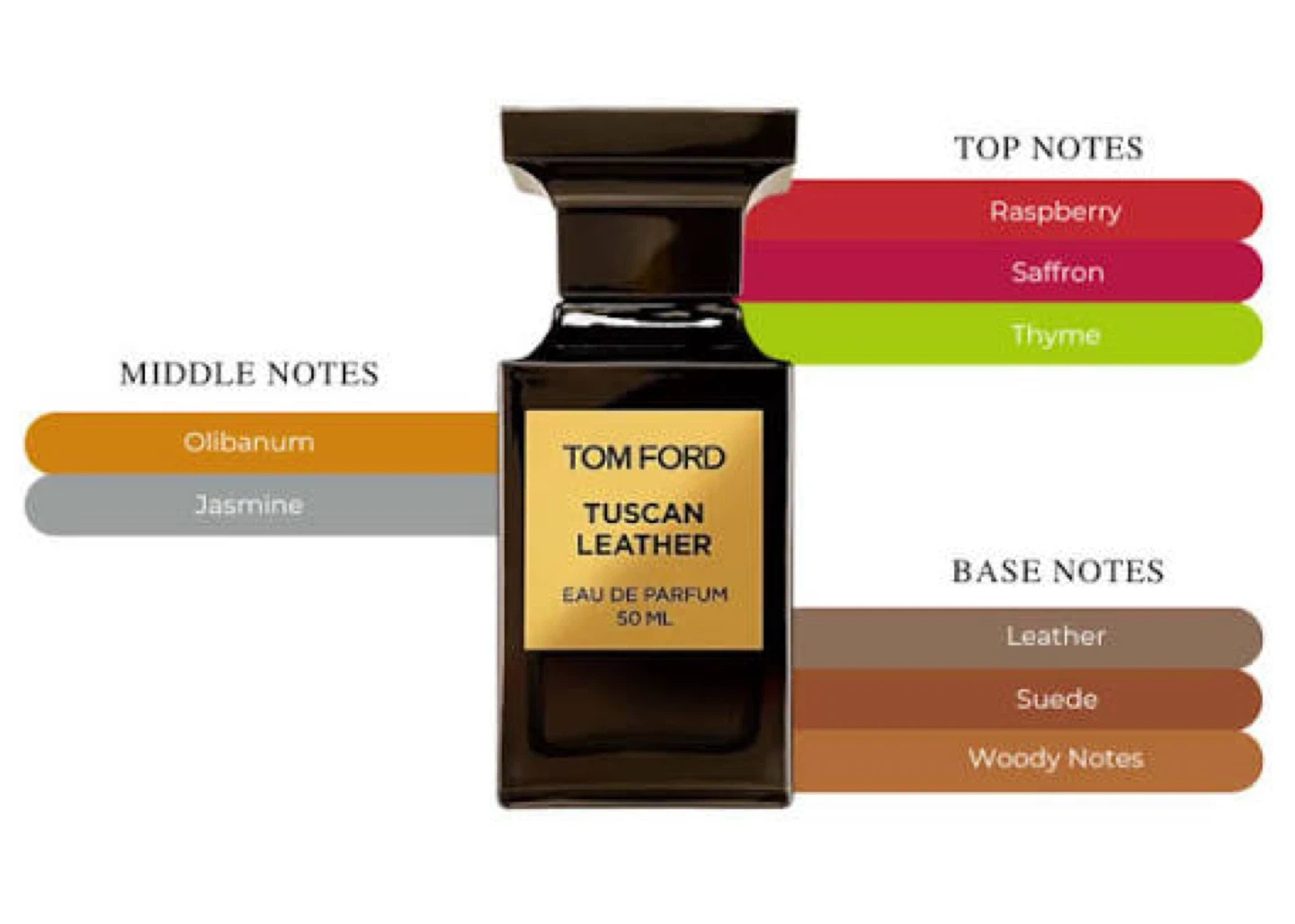 Top notes include raspberry, saffron, and thyme. Middle notes feature olibanum and jasmine, while the base notes consist of leather, suede, and woody notes