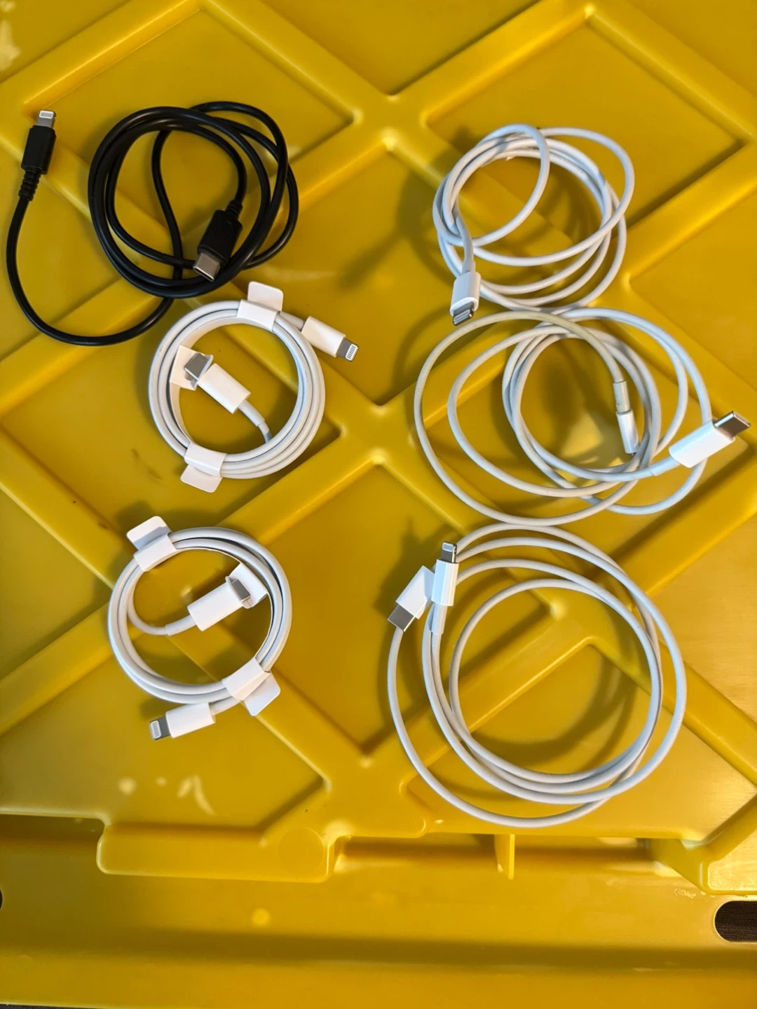 Selling a collection of USB-C to lightning charging cables for iPhone and iPad. The 5 white cords are Apple brand, the black is an unknown brand.