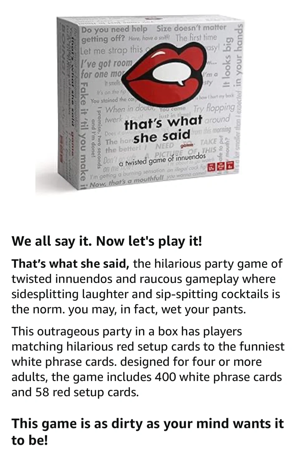 Great for parties! Fast paced and hilarious on every turn—a naughty twist to Cards Against Humanity.