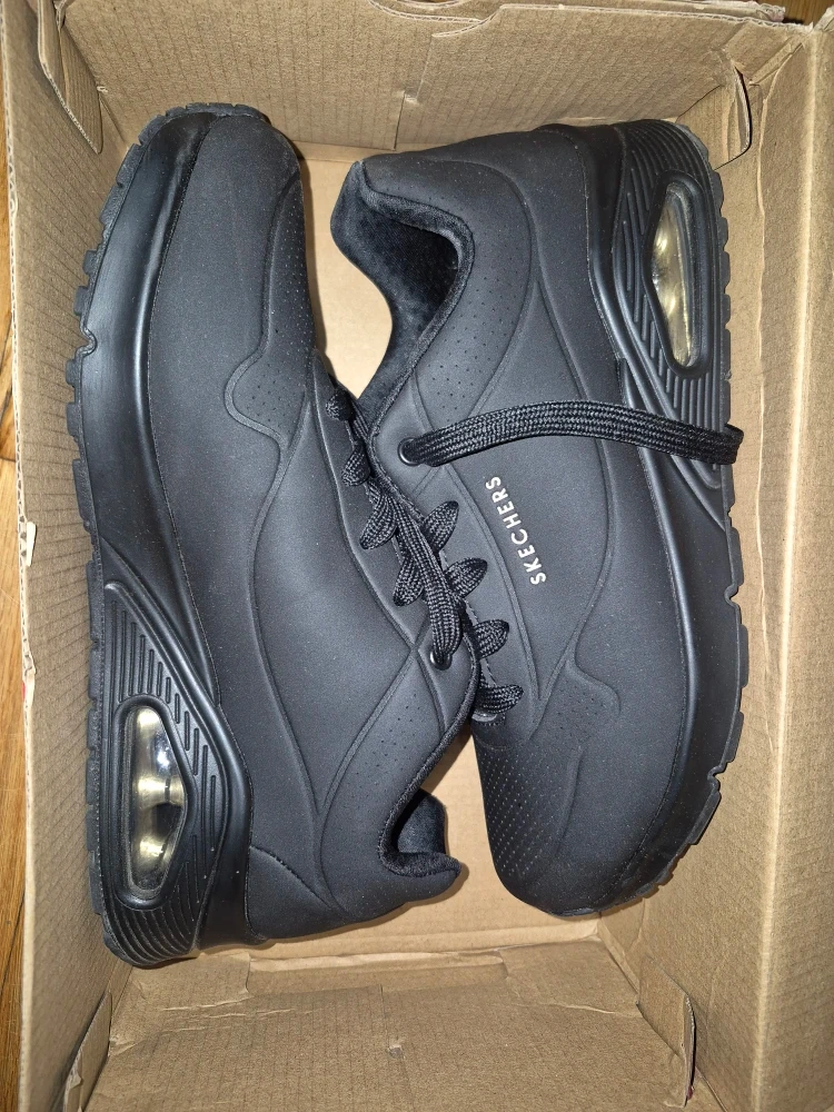 Selling a pair of Skechers Uno Stand On Air sneakers in black, size 9 US. They come with the original box. These are in great condition and ready for a new owner!