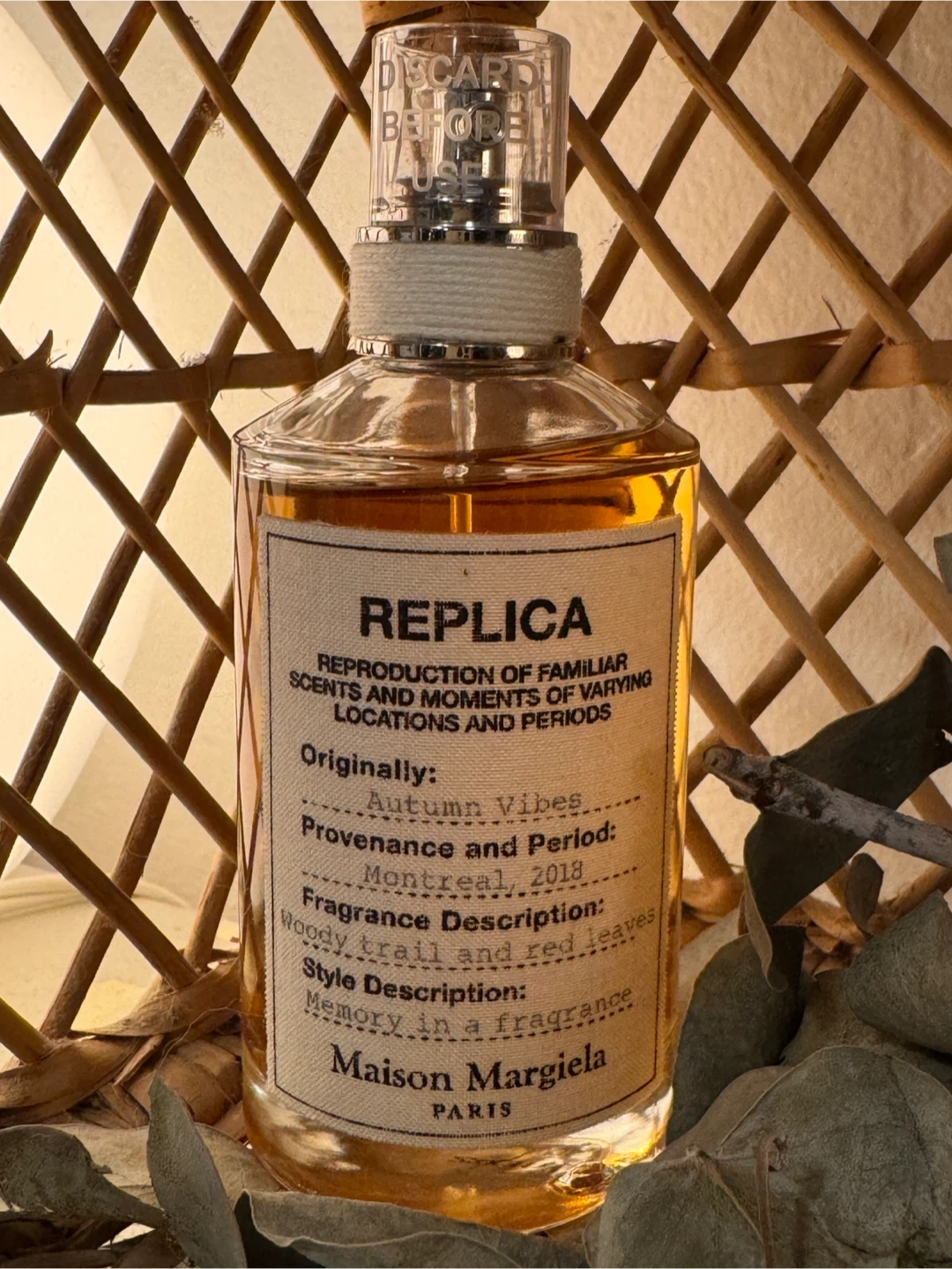 Selling a bottle of Maison Margiela Replica Autumn Vibes perfume. It's a lovely fragrance with notes of woody trail and red leaves, designed to evoke a memory in a fragrance. The provenance and period are Montreal, 2018.