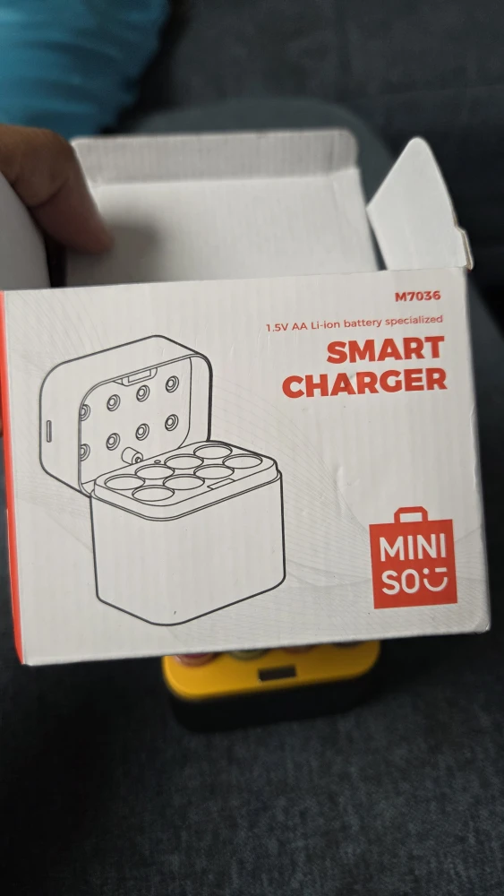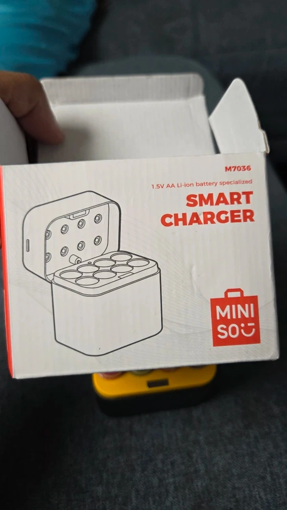 Selling a MINISO Smart Charger! It's in great condition and comes with the original box. This charger is designed for 1.5V AA Li-ion batteries. It features an LED light and a Type-C port for convenient charging. The charger also has a cover and functions as a battery storage box