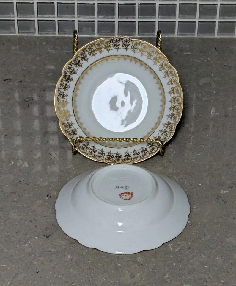 Beautiful set of 4 small porcelain bowls marked D & C Limoges (France) — elegant vintage pieces with gold-gilt edge and classic design. Great for collectors, vintage tableware enthusiasts, or as decorative display pieces.