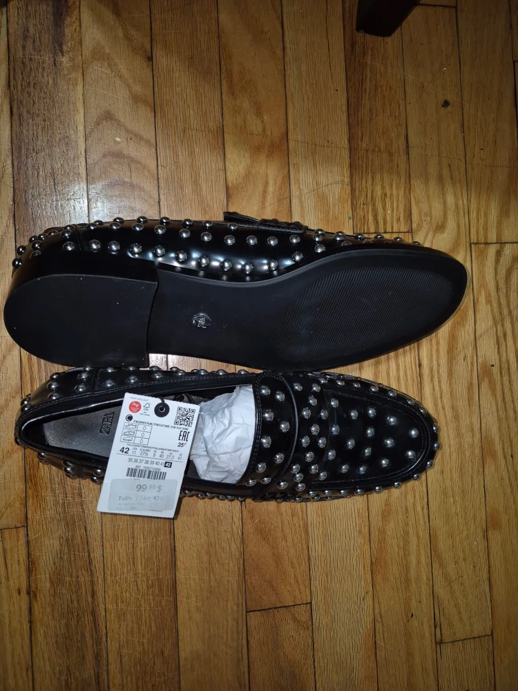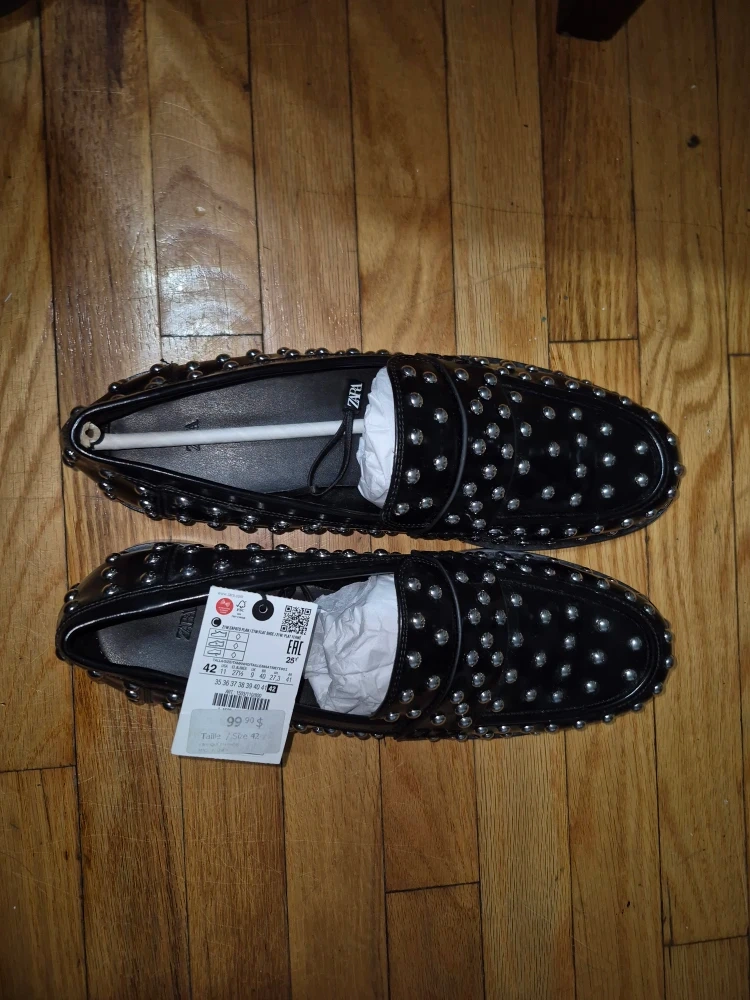 These stylish Zara loafers are a size 11. They feature a cool studded design on a sleek black base. The original price tag shows $99. They are in great condition and ready to add some edge to your wardrobe. Unisex