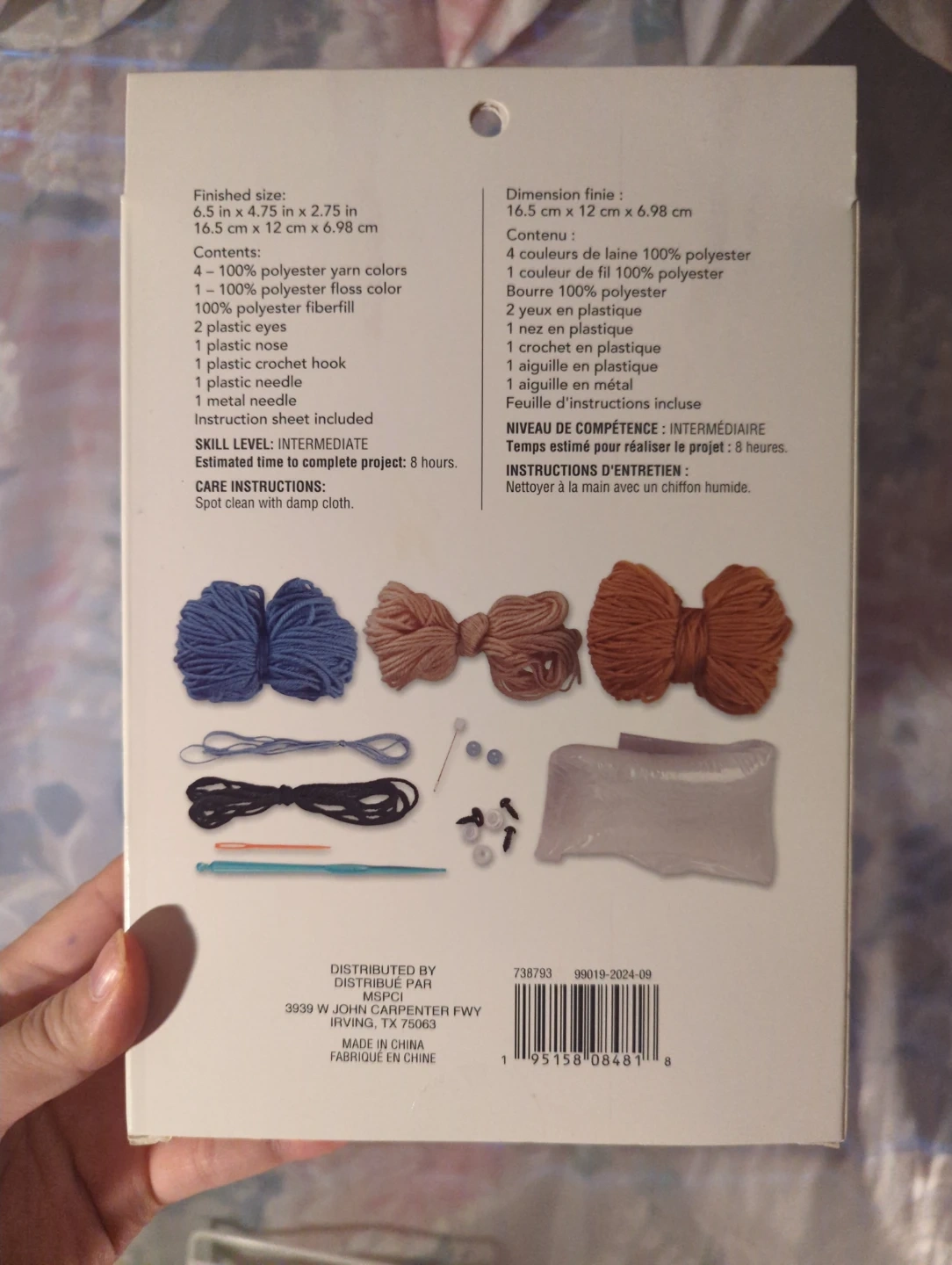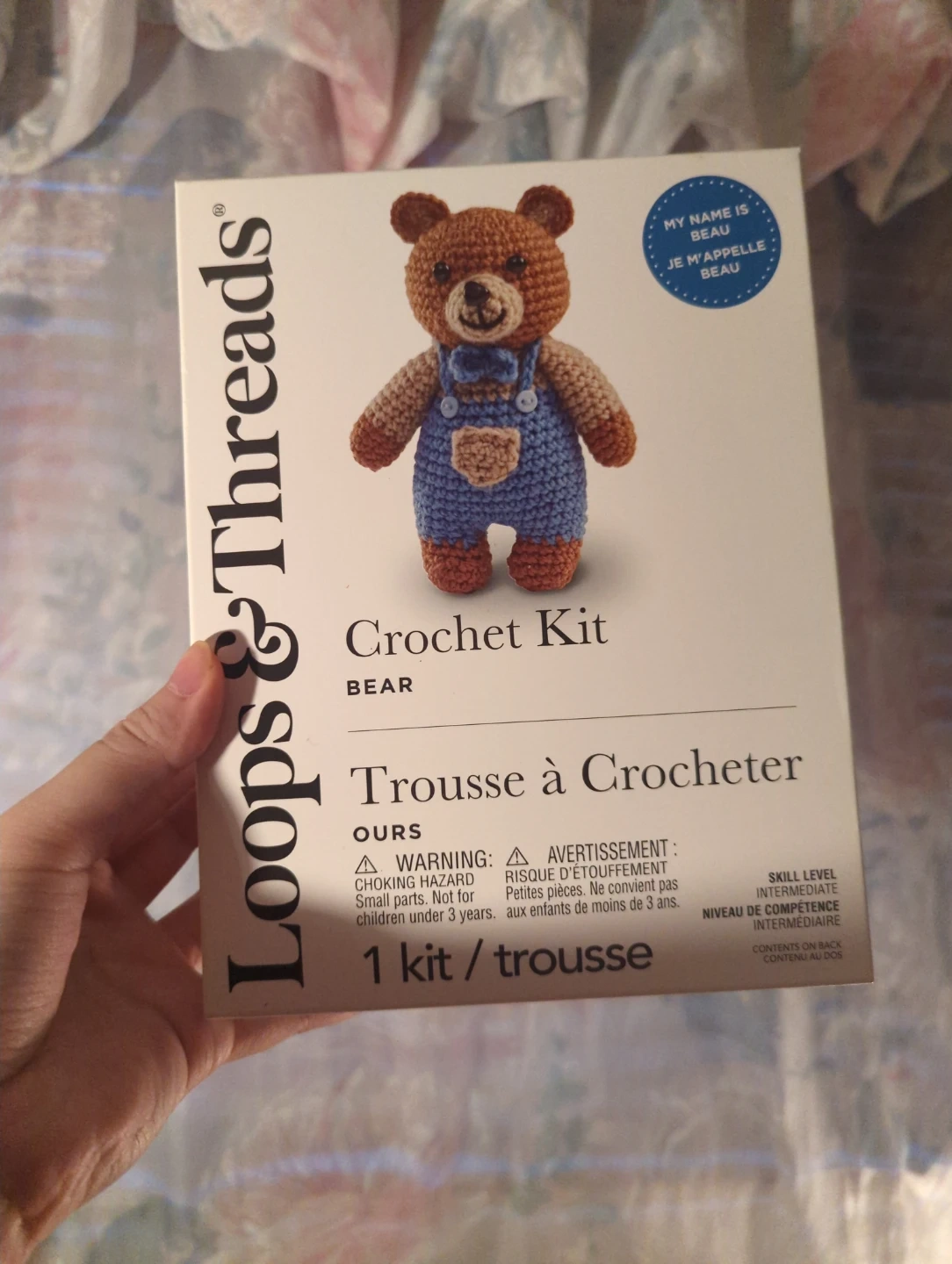 Loops & Threads Crochet Kit for making a cute little bear! This kit includes everything you need to create your own handmade teddy bear. The finished size is 6.5 in x 2.75 in x 2.75 in (16.5 cm x 12 cm x 6.98 cm). It's perfect for intermediate skill levels and contains yarn, fiberfill, plastic eyes and nose, crochet hook, needle, and instructions