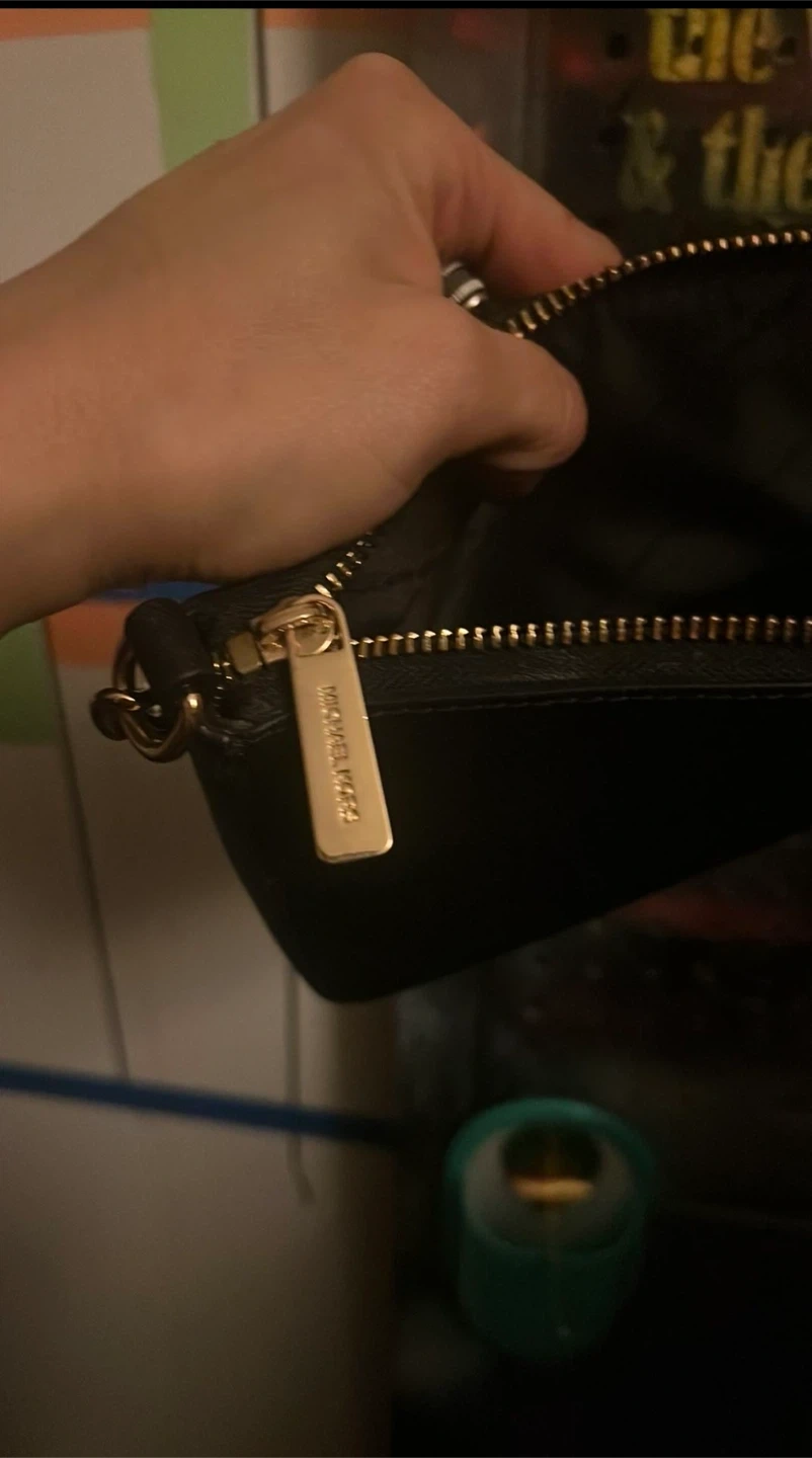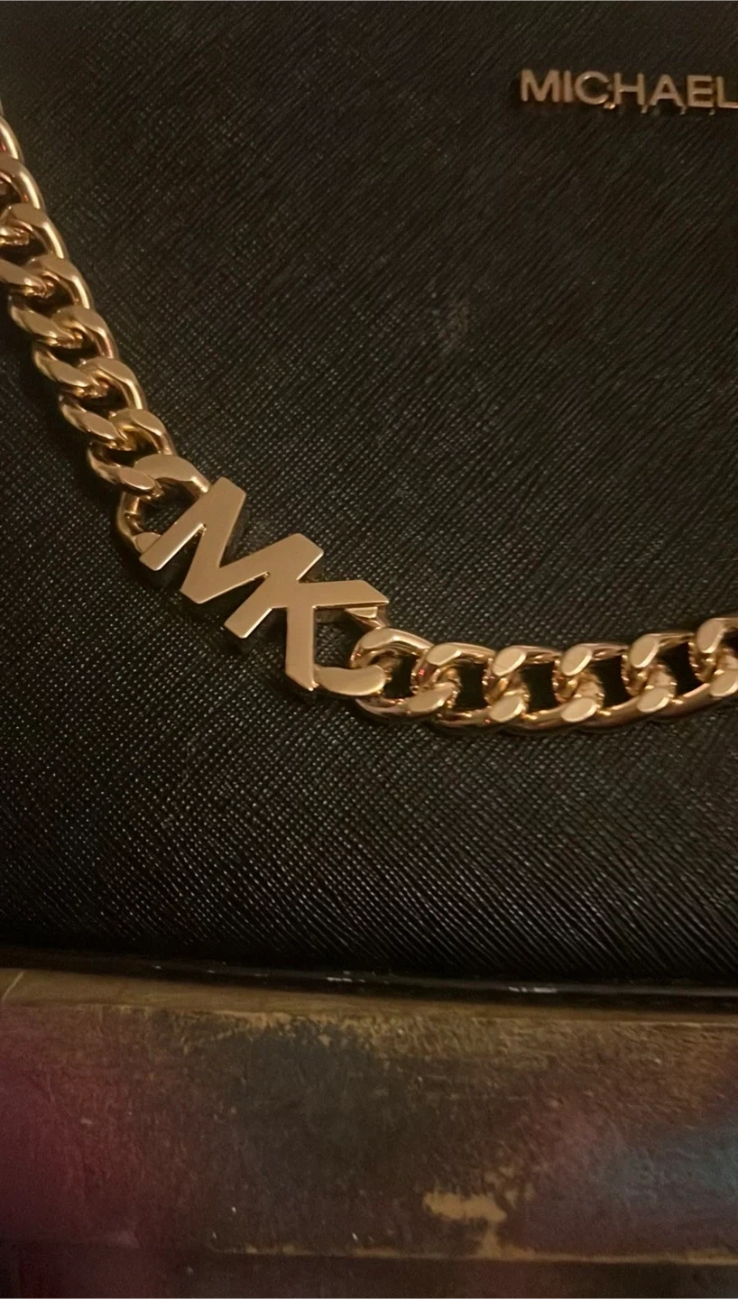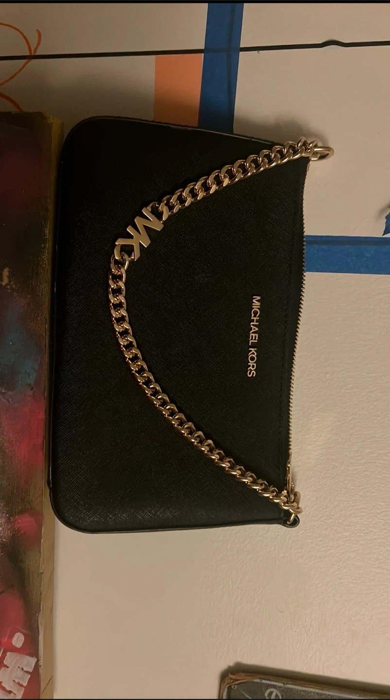 Selling a stylish Michael Kors handbag in black. It features a gold chain accent and the MK logo. The bag has a zipper closure and is in good condition. Perfect for adding a touch of elegance to your outfit!