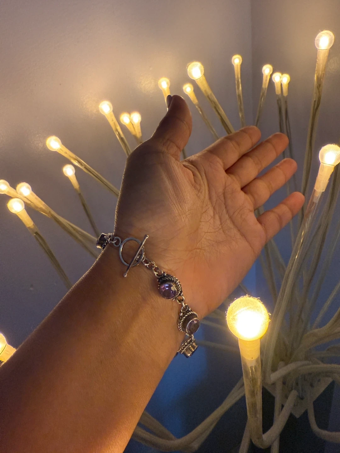 This is a beautiful amethyst and silver bracelet. It features round amethyst stones set in a detailed silver setting. It's in great condition and ready to add a touch of elegance to your wrist!