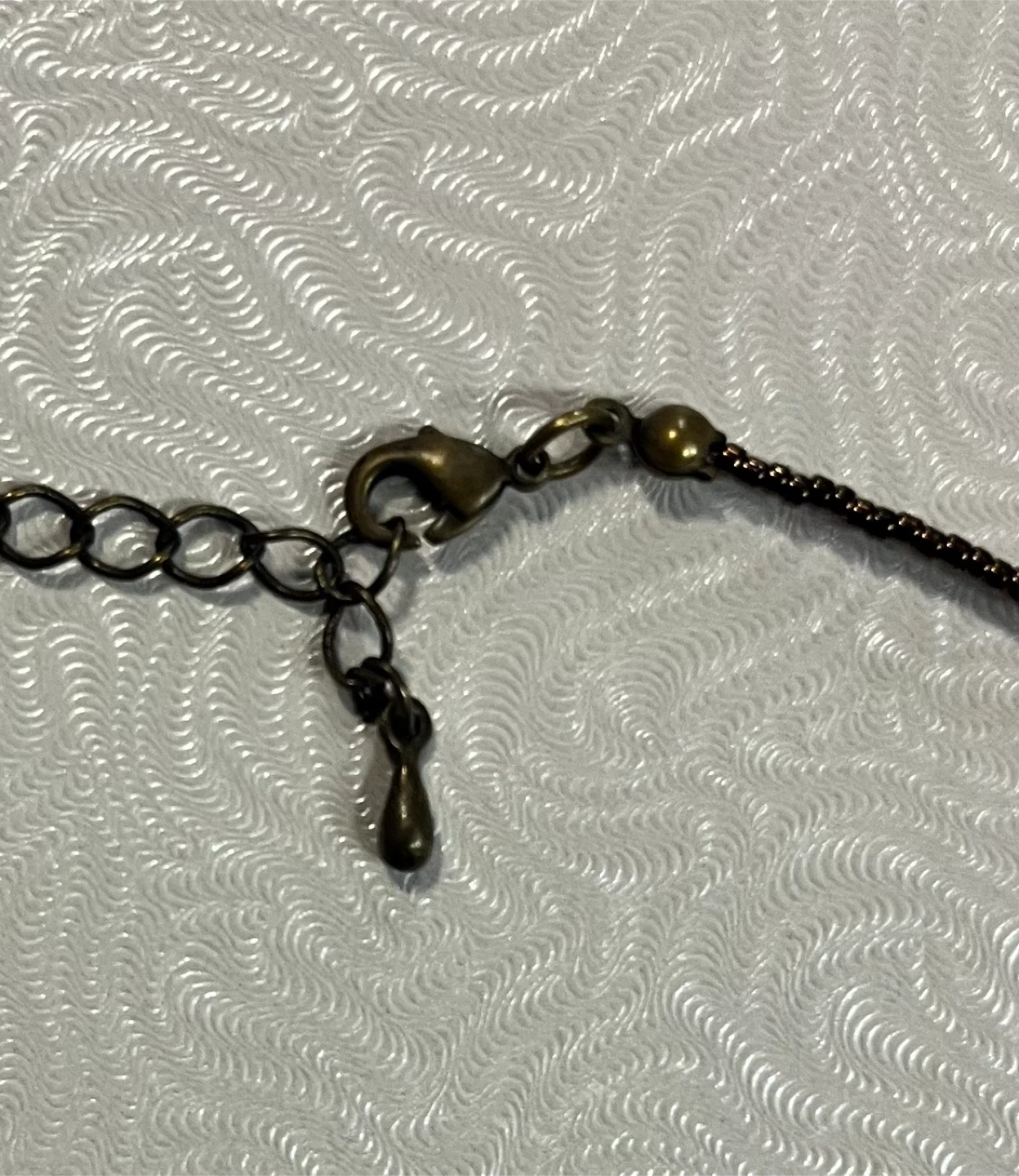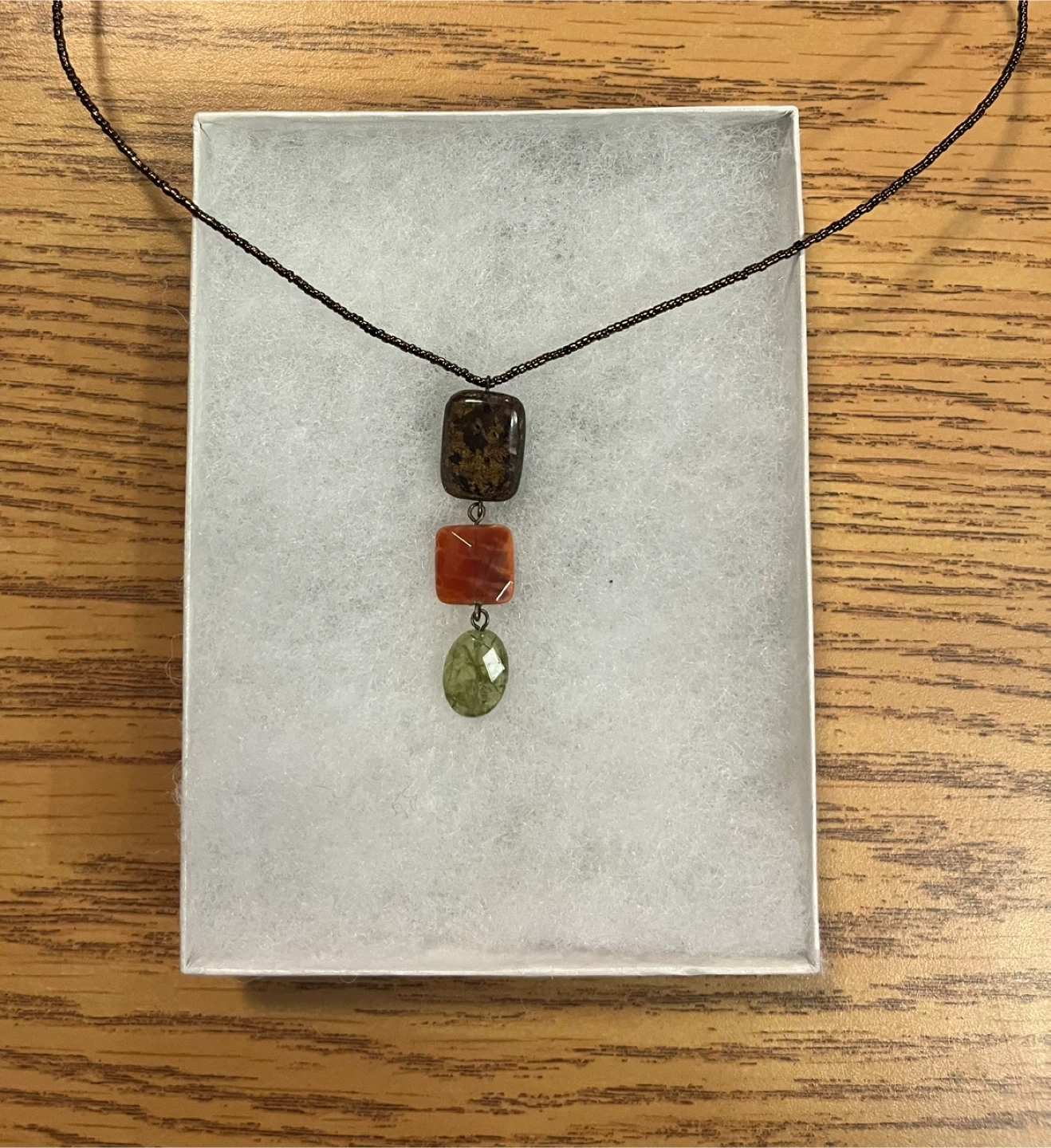 Here's a beautiful necklace and earring set! The necklace features three different coloured stones, and the earrings match perfectly. They come in a box for safekeeping