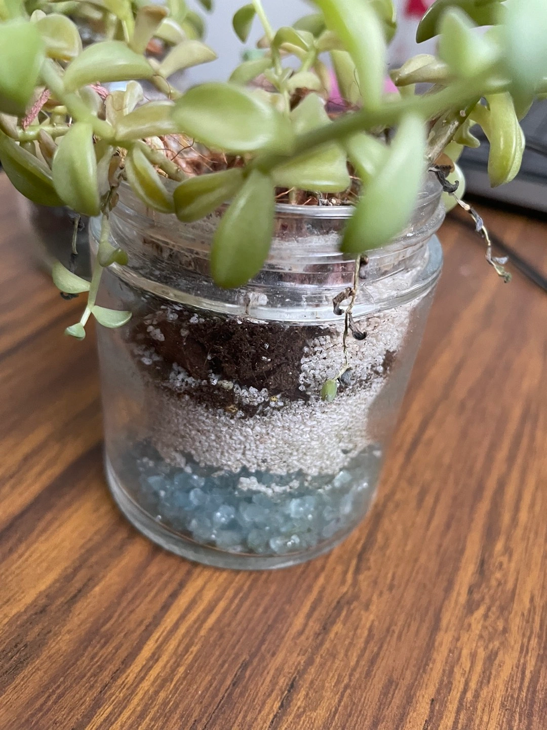 Currently in glass container and I have added enough marbles and perlite. No worry to re-pot!