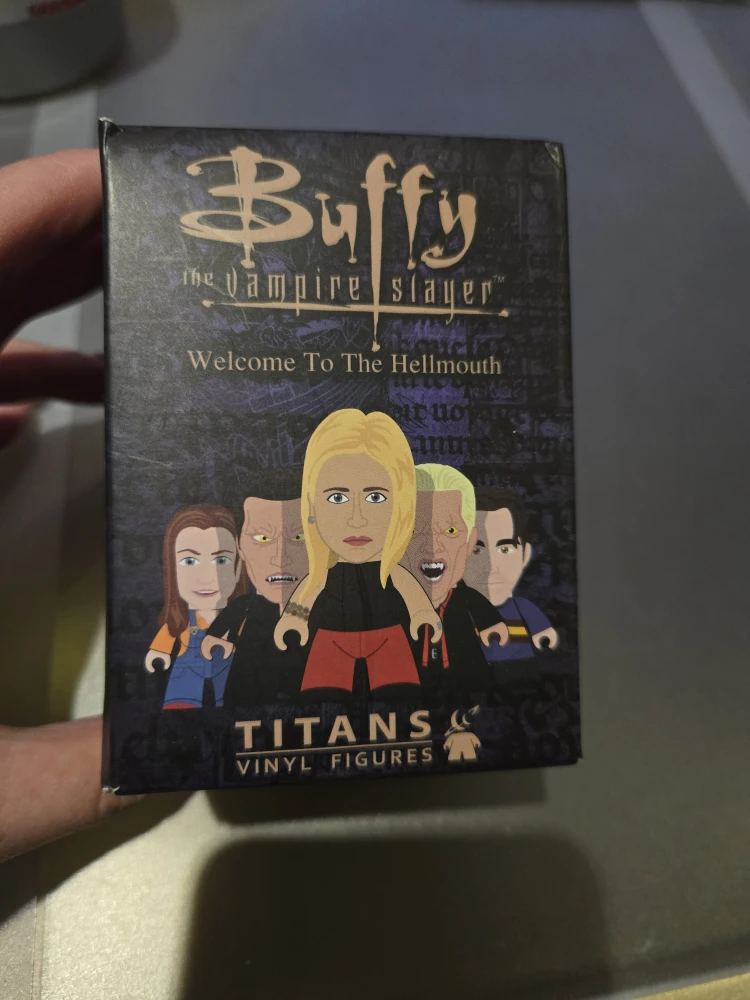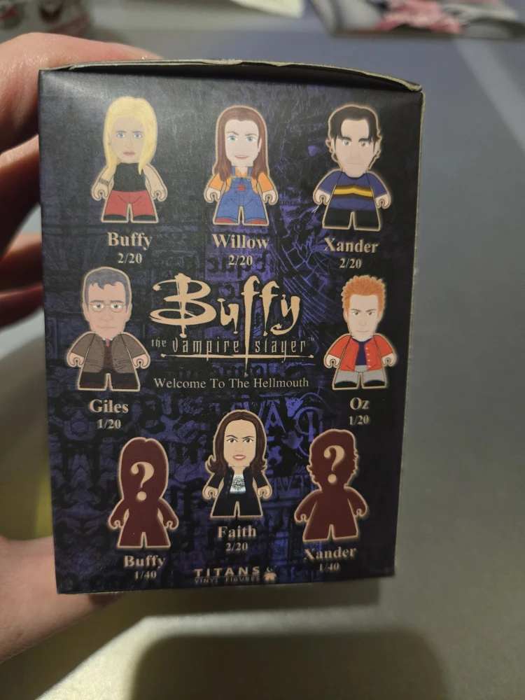 Selling a sealed Buffy the Vampire Slayer Titans Vinyl Figure blind box. The box shows the different figures in the collection, including Buffy, Willow, Xander, Giles, Oz, Faith, Angel, Spike, Drusilla, The Master, The Mayor, and some mystery figures.
