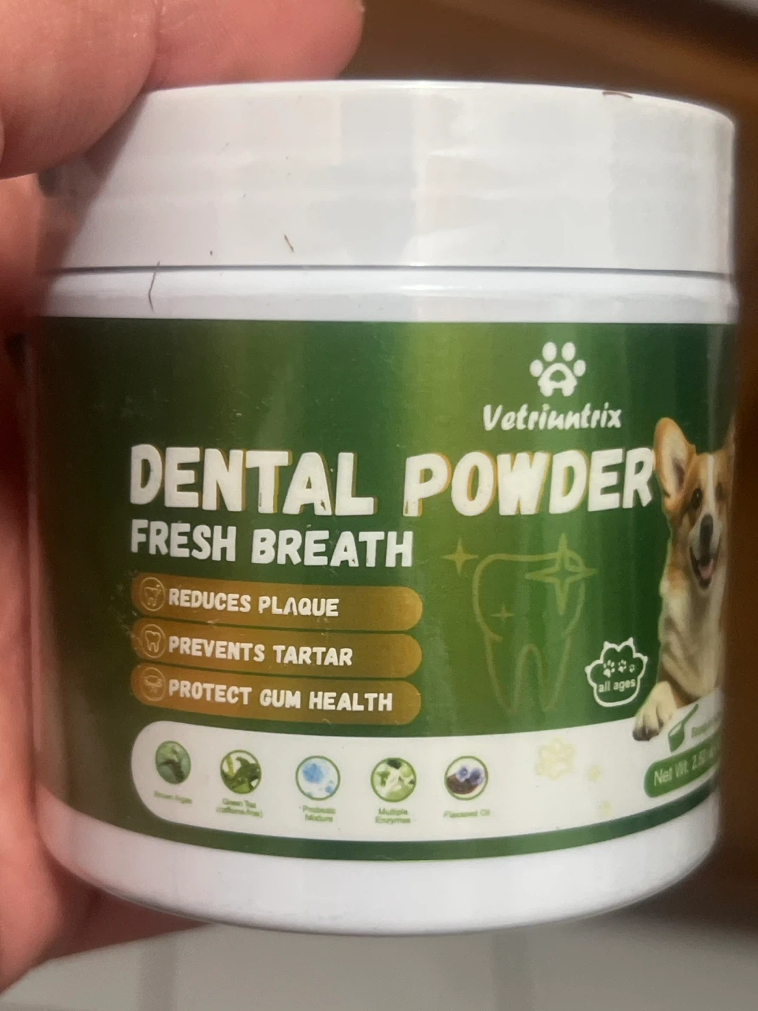 I'm selling a Vetriuntrix dental powder that helps with fresh breath. It reduces plaque, prevents tartar, and protects gum health. Scoop is included! Net weight is 2.82 oz (80g)
