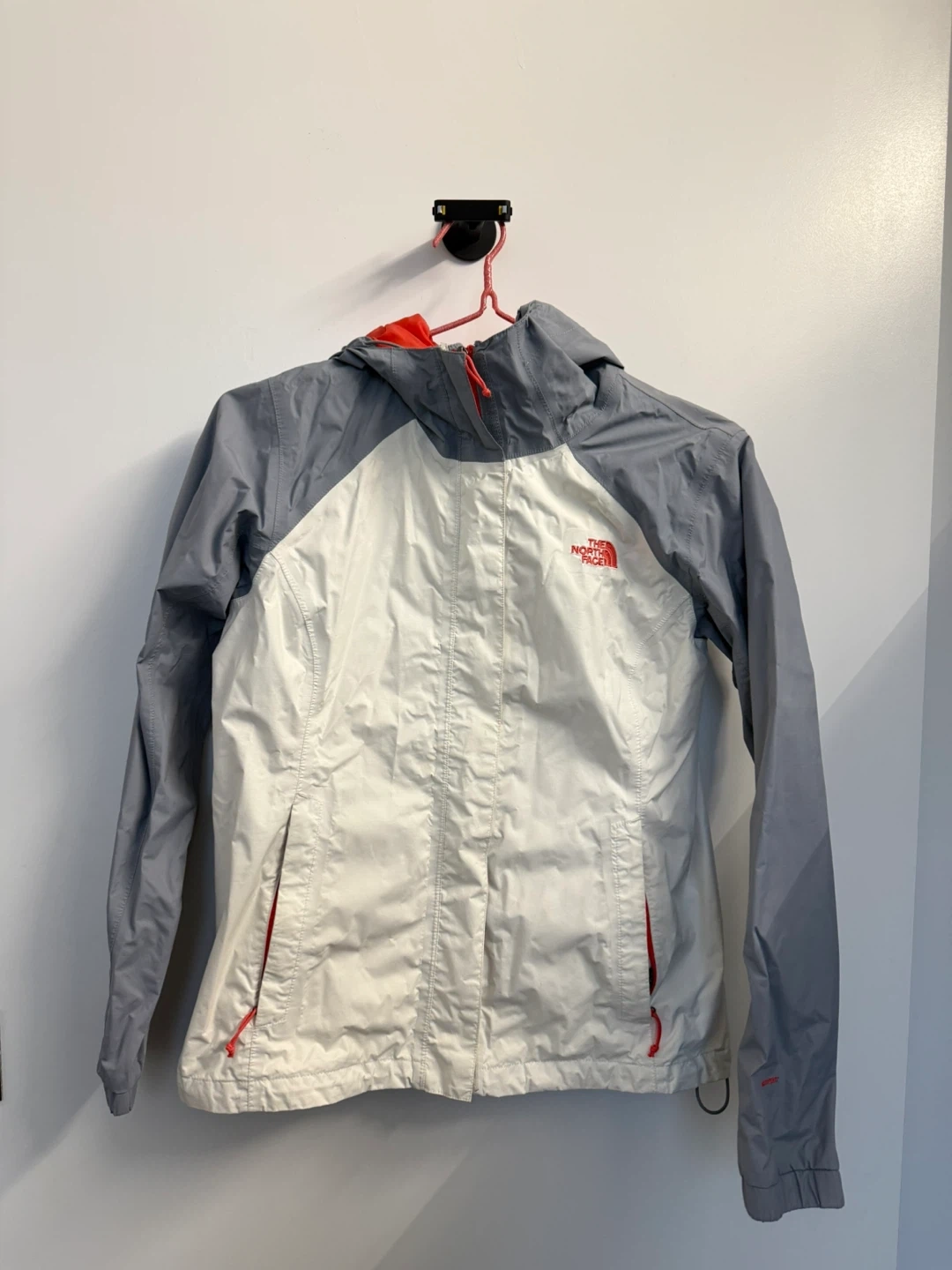 Selling a The North Face women's jacket in size small. It's a stylish colour block of grey and off-white with red detailing. The jacket features DryVent technology, making it great for outdoor activities!
