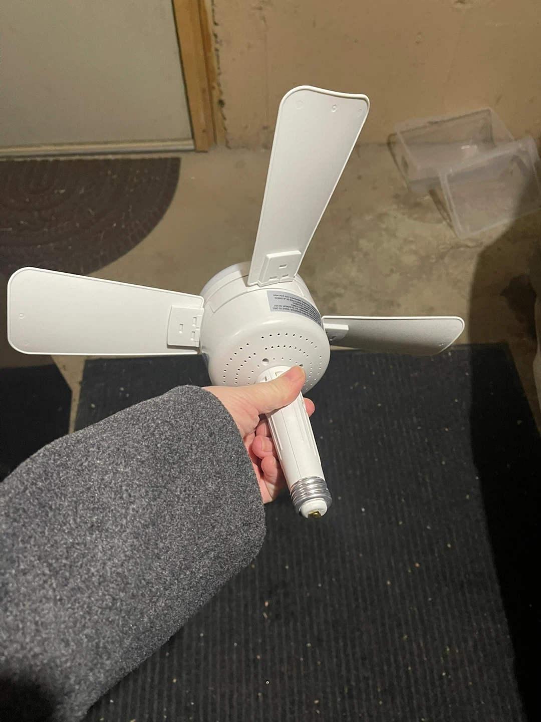 Here's a handy ceiling fan that fits into a standard light bulb socket! It's perfect for adding a little breeze to smaller spaces like closets or bathrooms. It's in great shape and ready to use