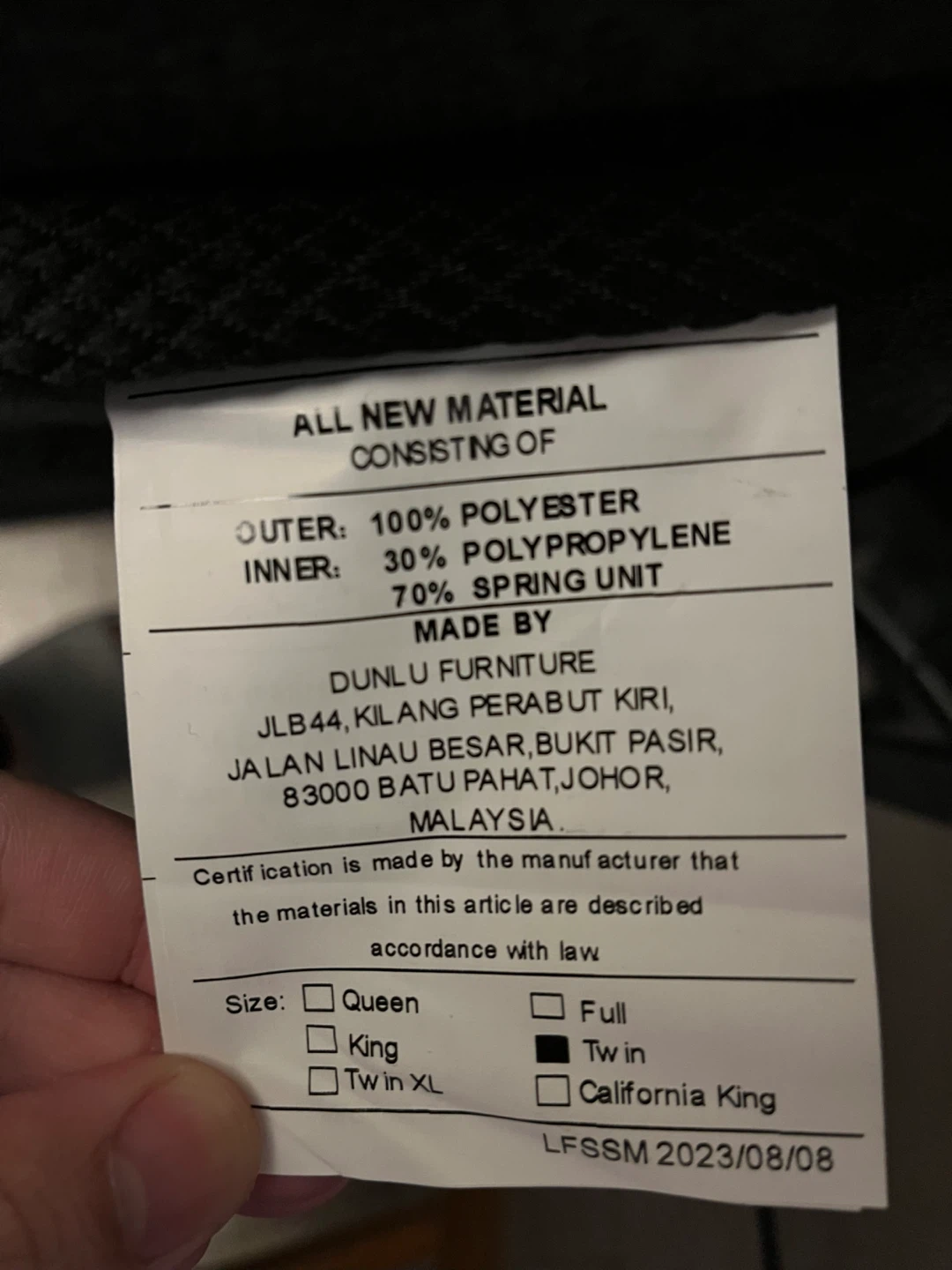 - Inner material: 30% polypropylene, 70% spring unit