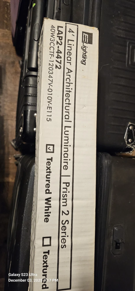 Selling a 4' Linear Architectural Luminaire from E Lighting, Prism 2 Series. It's a textured white colour. The box includes the model LAP2-4472. It is 40W, 120-347V and dimmable.