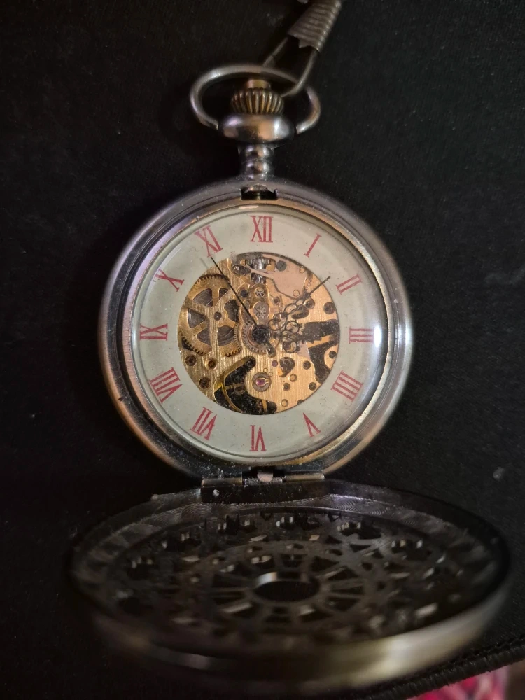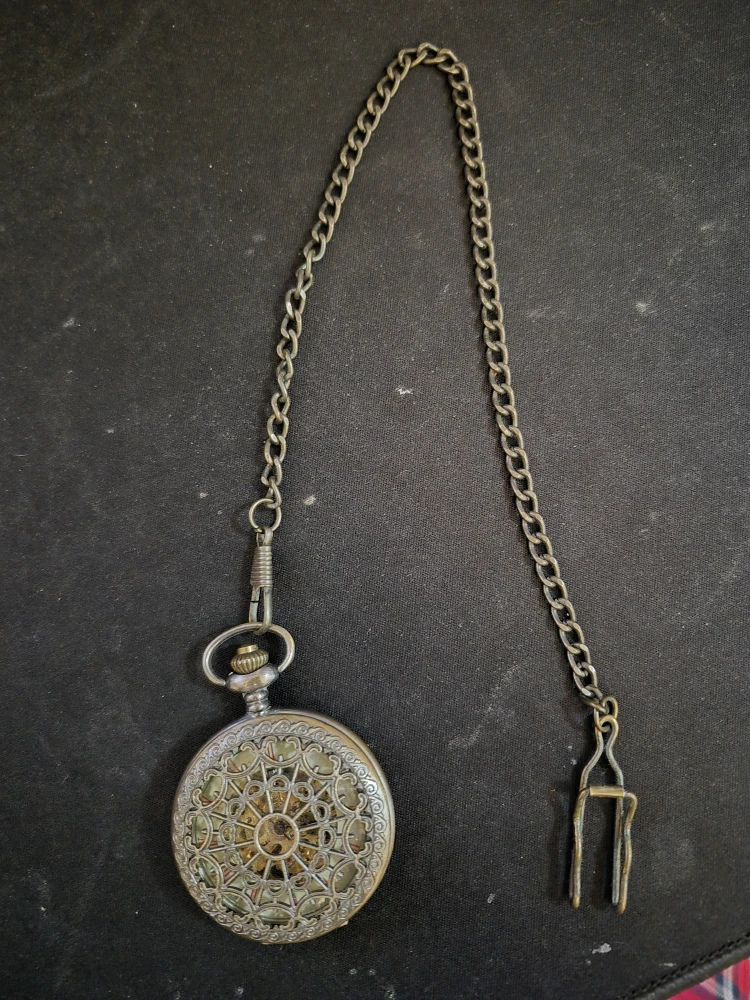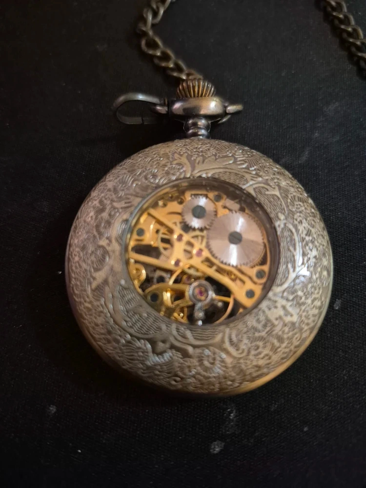 Selling a vintage-style pocket watch with a chain. It has an intricate design on the front and back, with a visible gear mechanism inside. The watch has Roman numerals on the face. It's in good condition!
