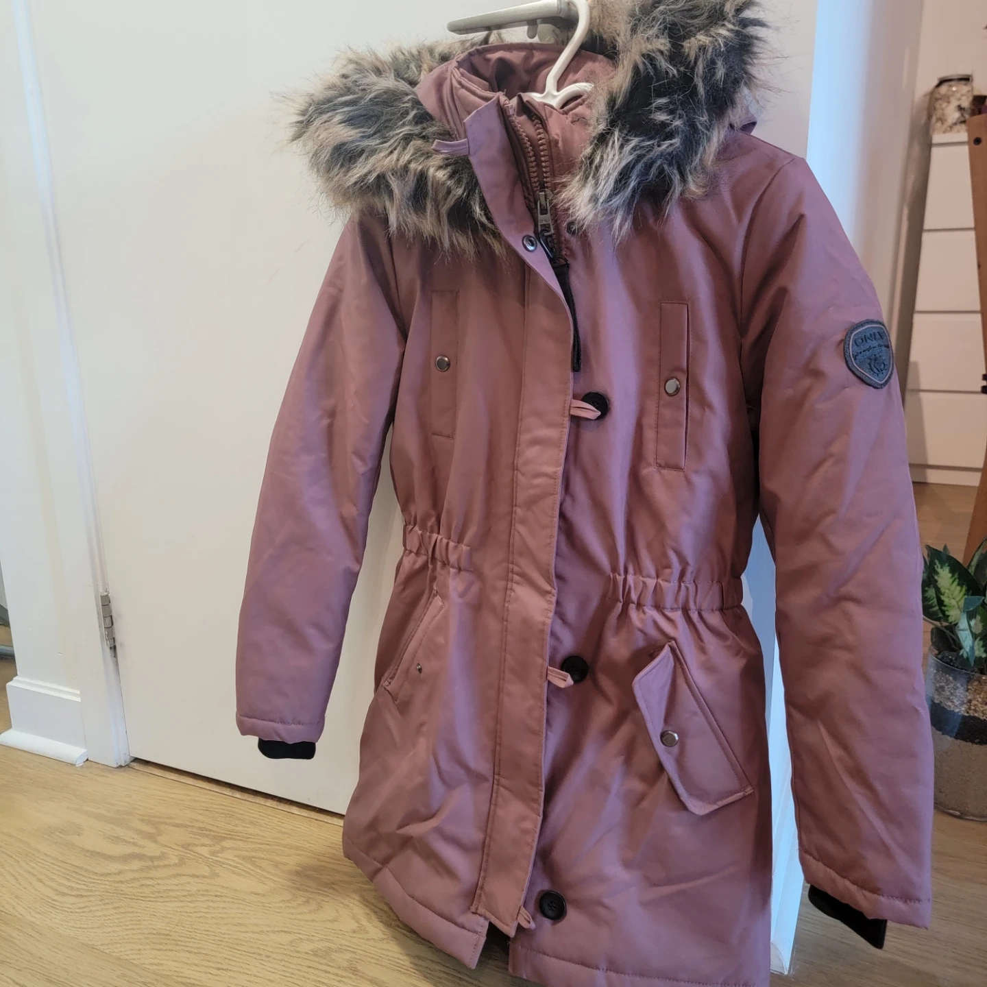 Here's a lovely pink winter coat from ONLY! It's in great condition and ready to keep you warm this spring/fall. The faux fur trim adds a touch of style, and the cinched waist gives it a flattering shape. Perfect for those chilly days!