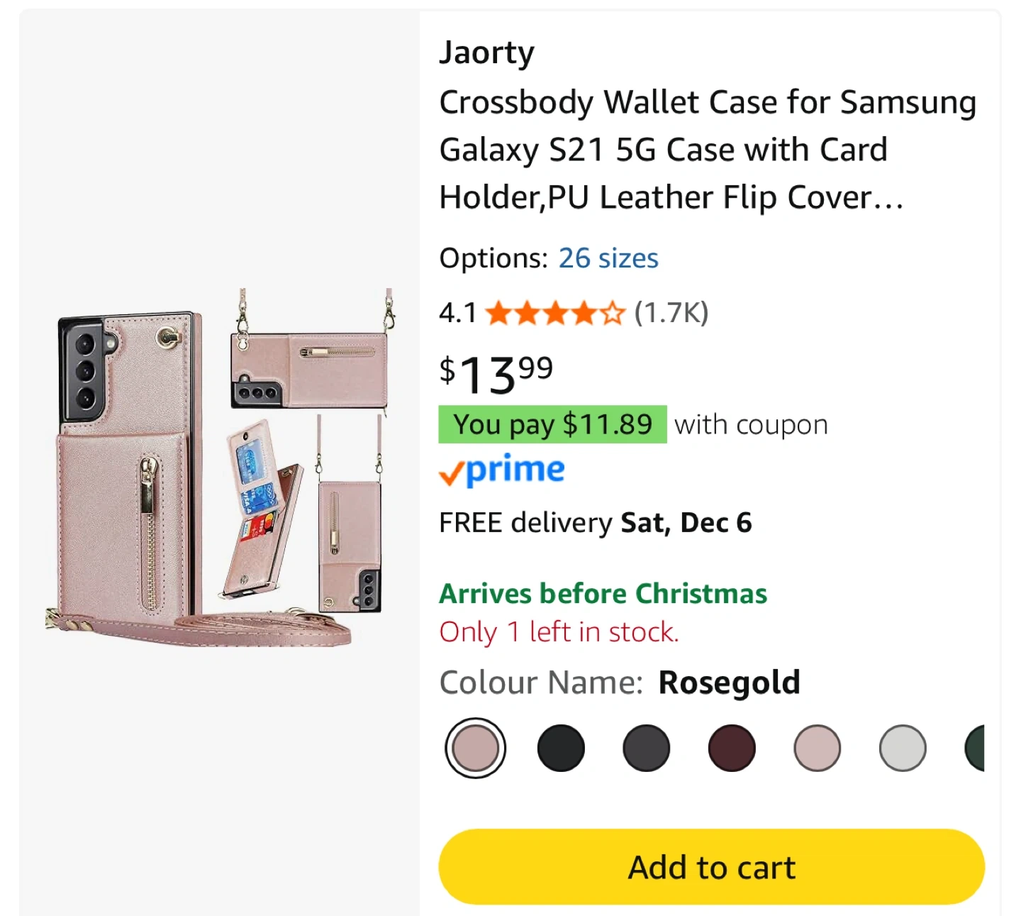 Selling a Jaorty crossbody wallet case for a Samsung Galaxy S21 5G. It has a card holder and a PU leather flip cover. The colour is rosegold. Originally bought for $13.99
