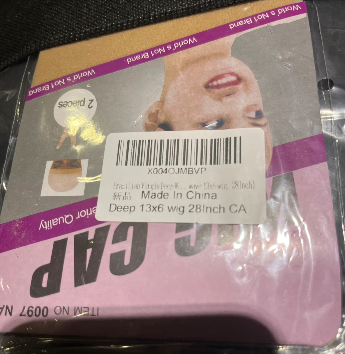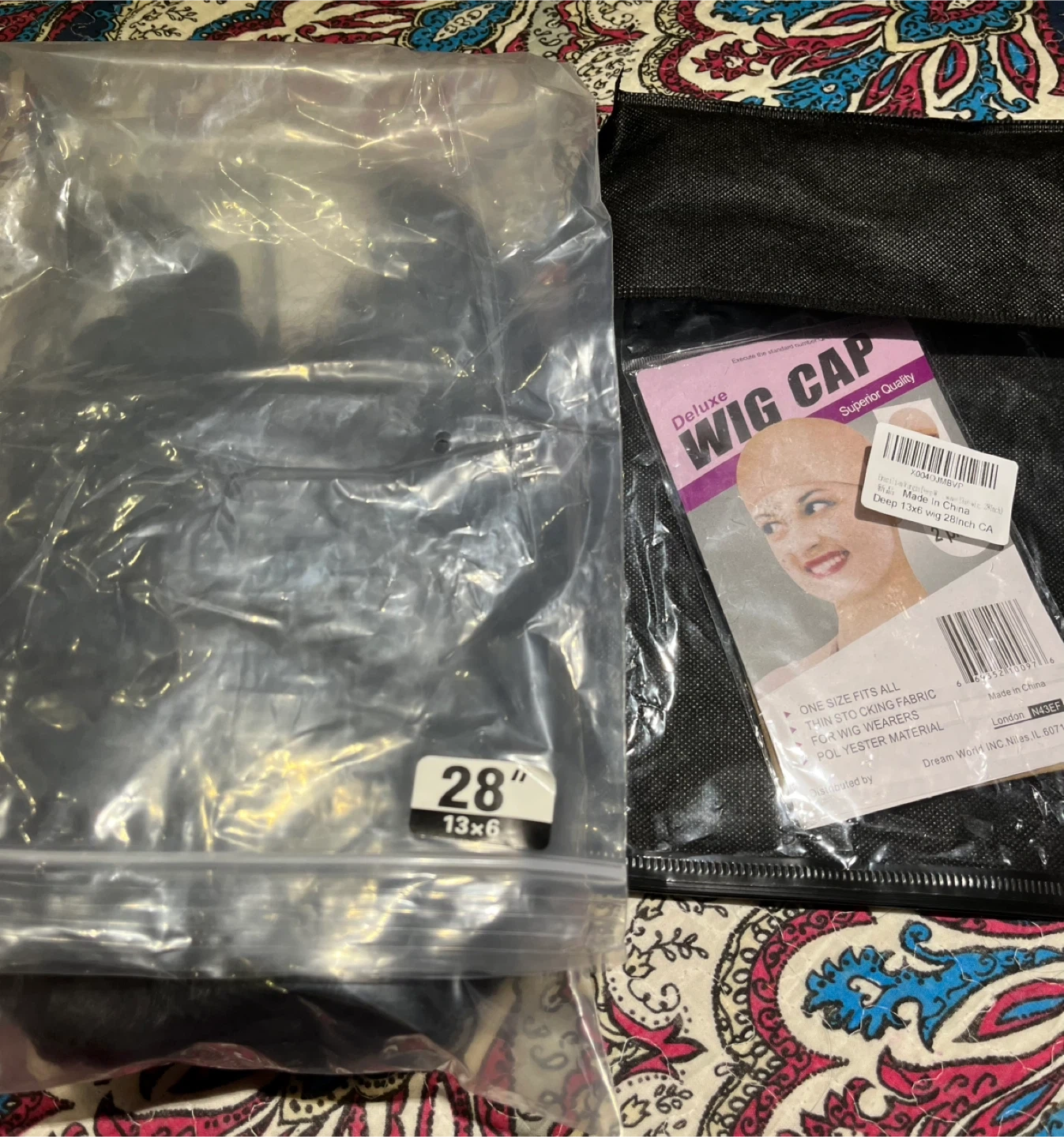 Selling a 28-inch, 13x6 deep wave wig. It also comes with a deluxe wig cap that's one size fits all. The wig cap is made with thin skin stocking fabric for all day wearers and is made of polyester material