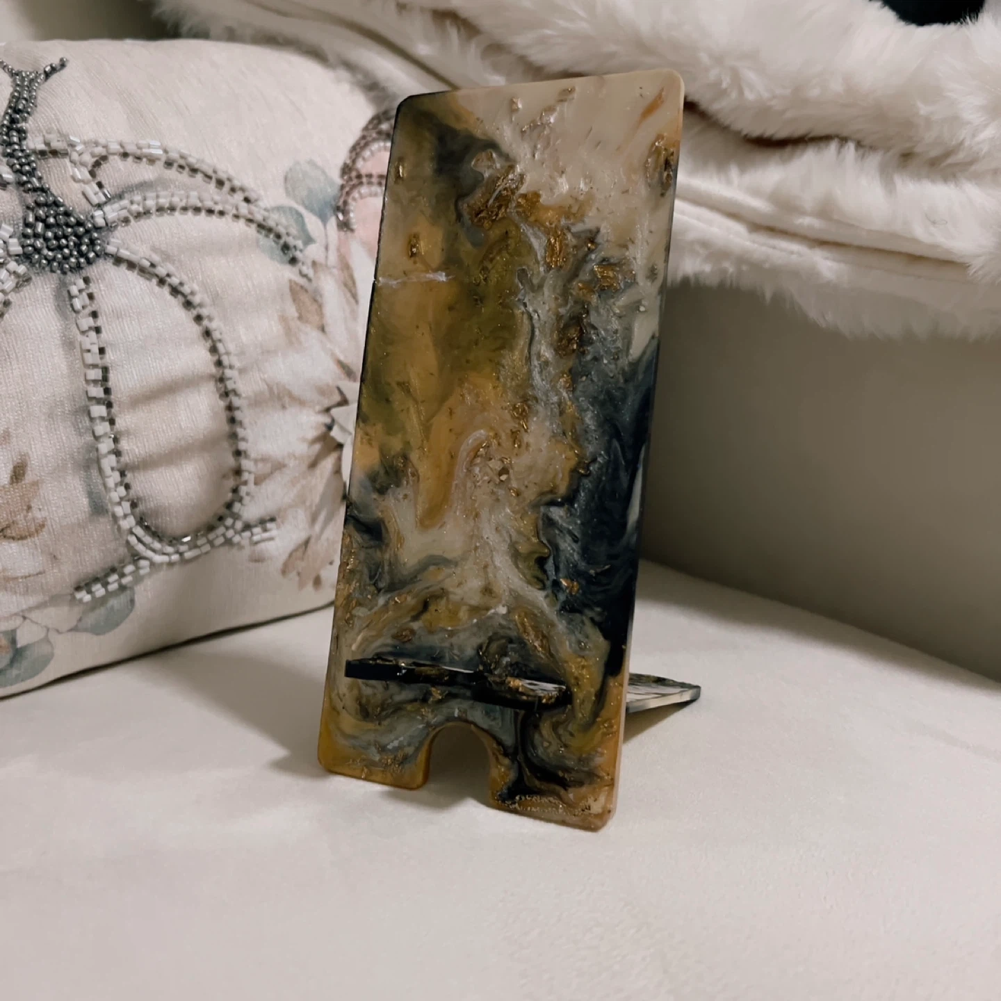 I'm selling a unique, handmade by me phone holder crafted from resin. It's perfect for keeping your remote organized and adding a touch of artistry to your living space. It's in great condition and ready to use!
