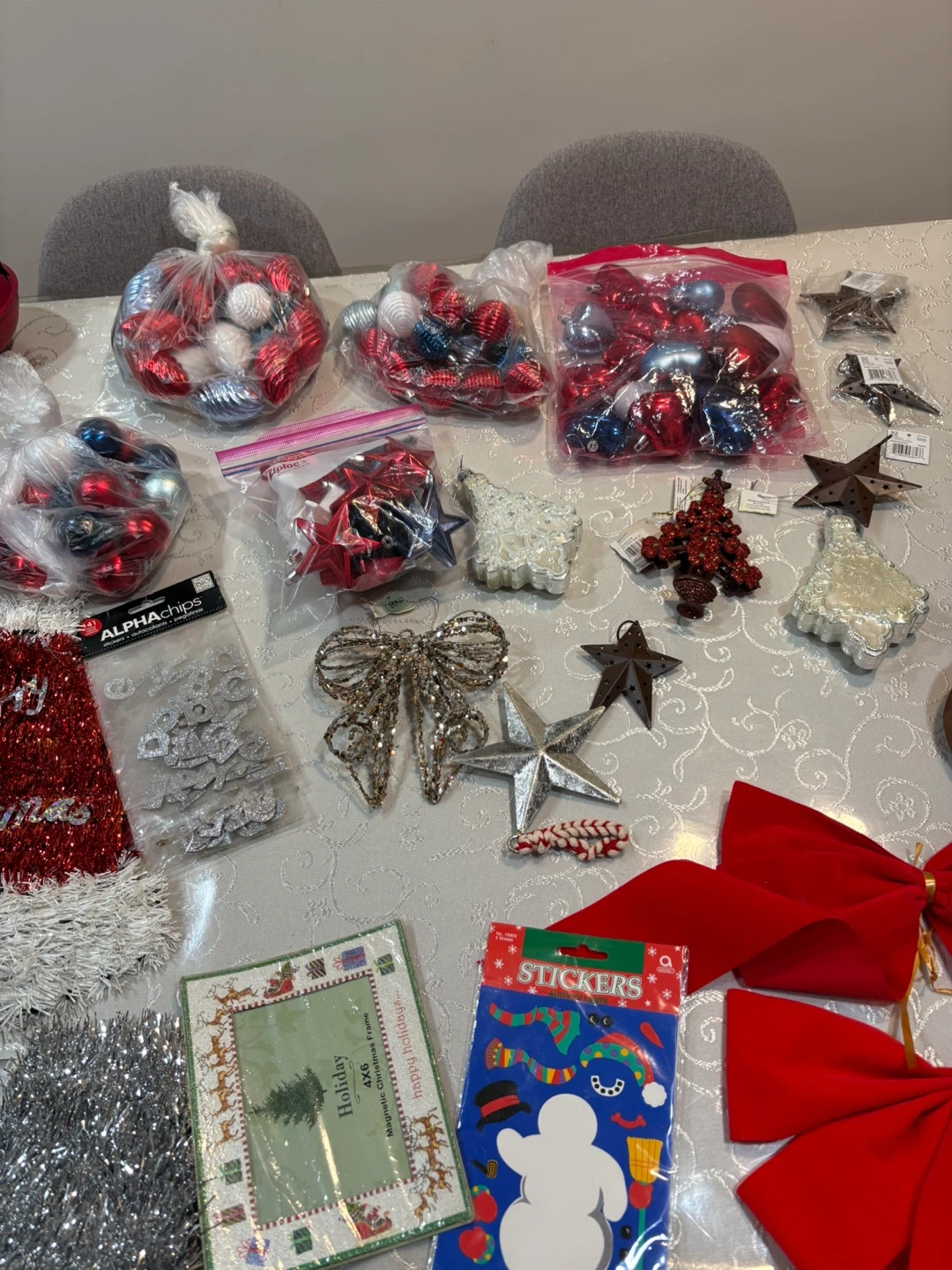 Selling a lot of Christmas and holiday decorations. There are various ornaments, tinsel, bows, and other decorative items to make your home festive for the holidays