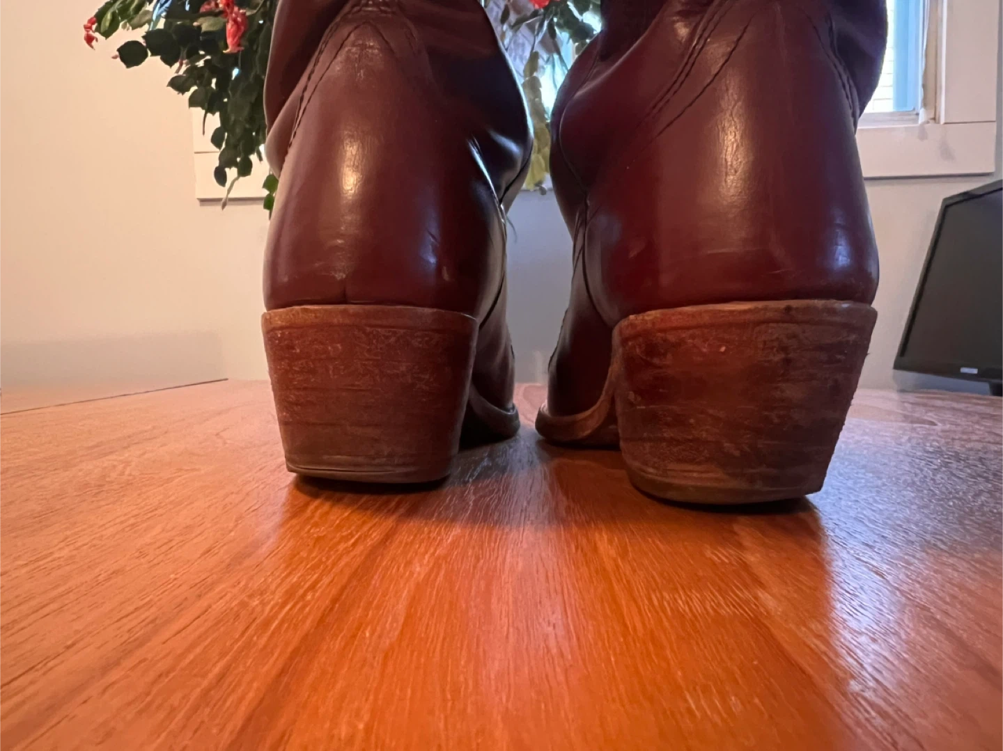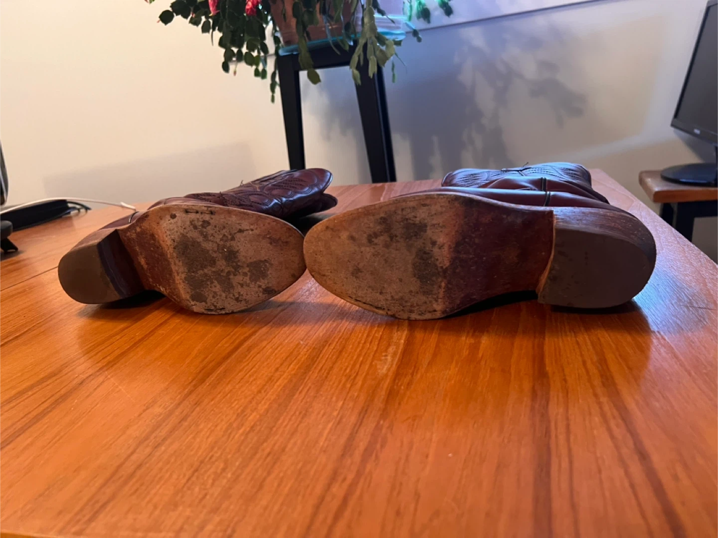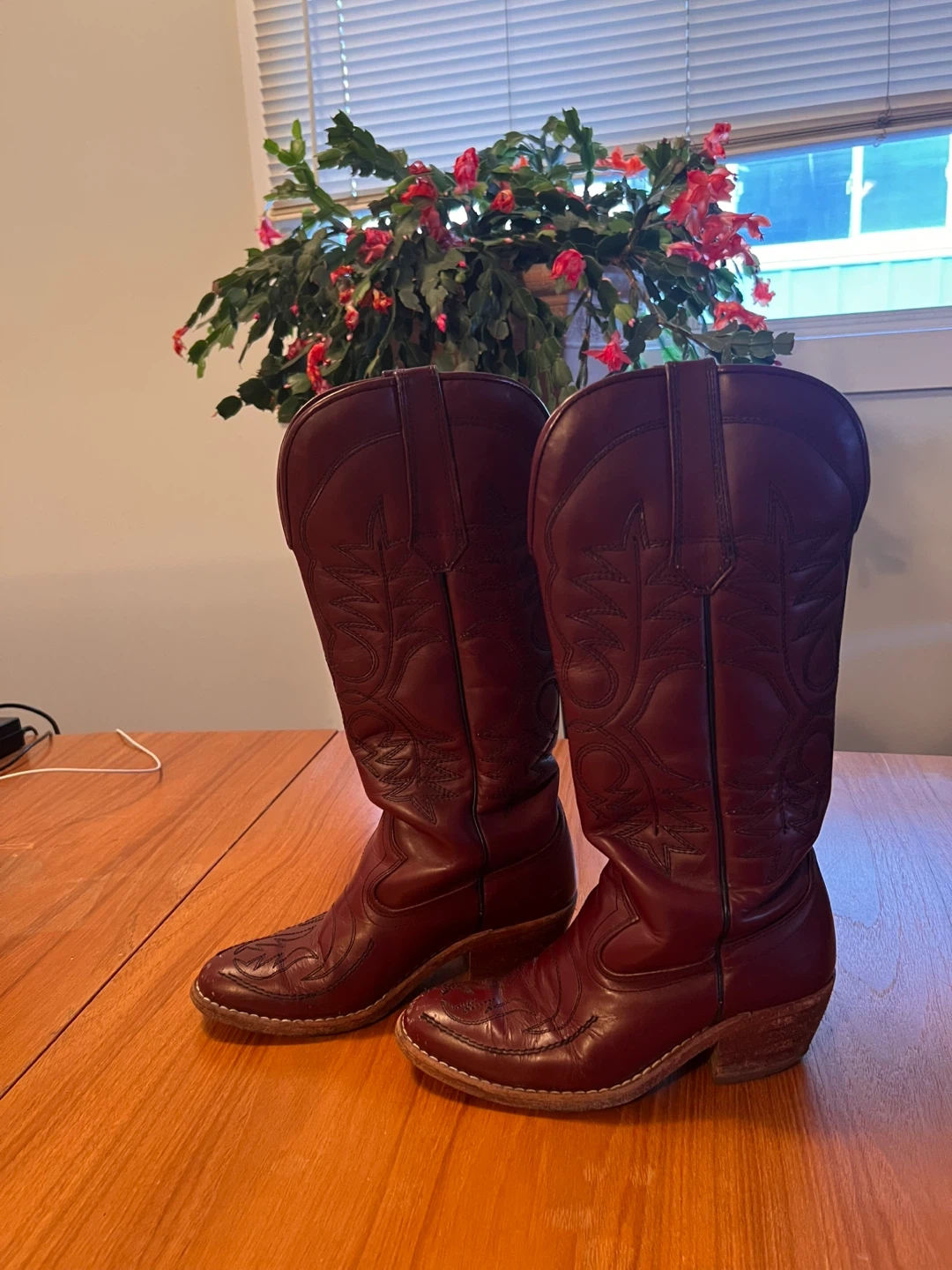 Selling a pair of burgundy cowboy boots! They have a classic western design and are perfect for adding some flair to your outfit. They show some signs of wear, but are still in good condition and ready for a new adventure! #Cleanout