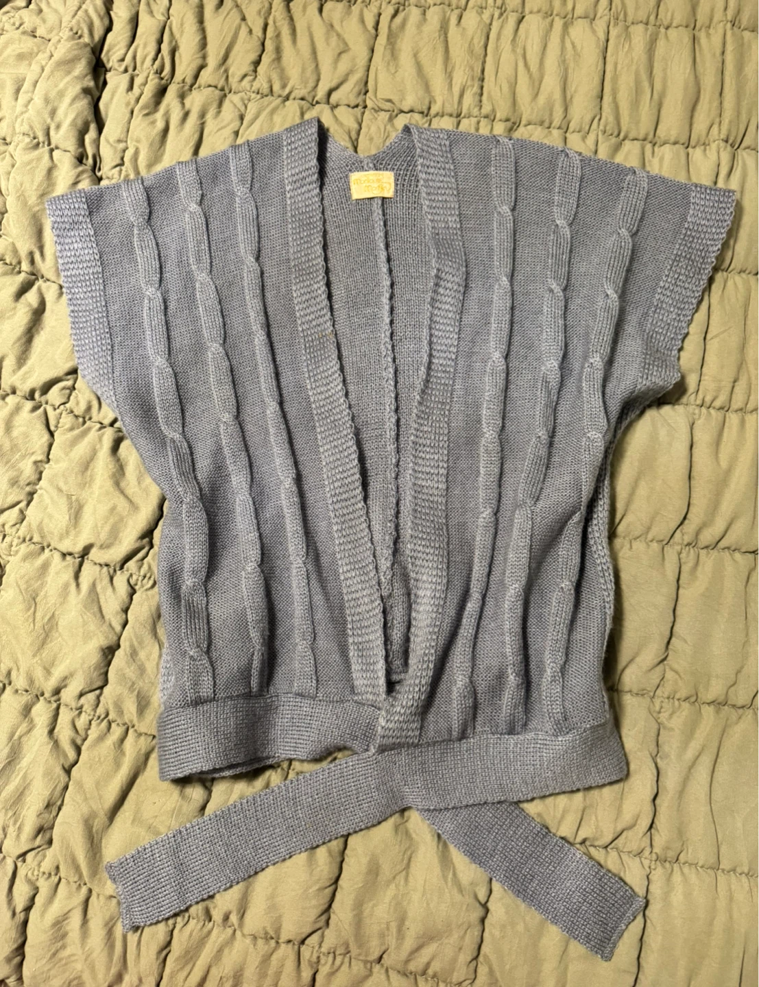 Here's a lovely blue knit top from Monique Morin! It's in great condition and ready for a new home. The material is soft and comfortable, perfect for layering or wearing on its own. It has a unique design with a tie waist.
