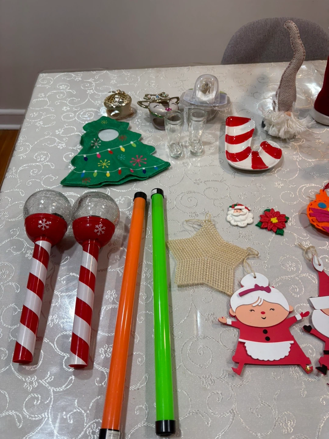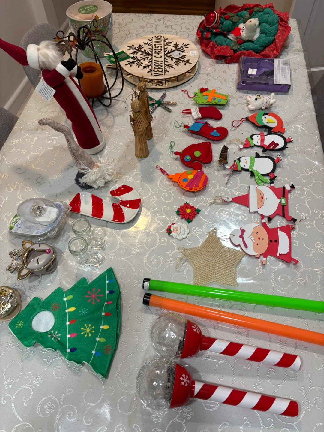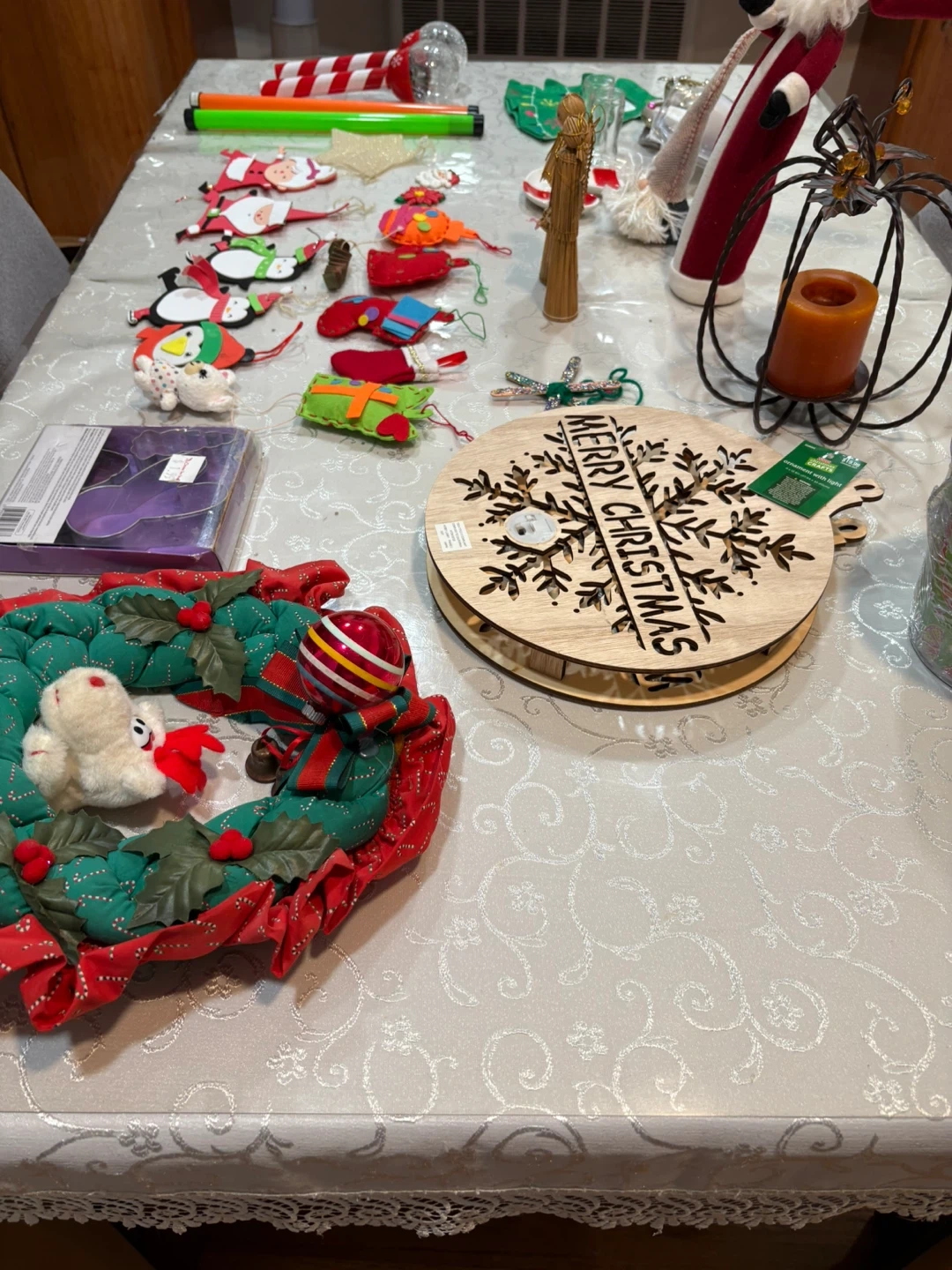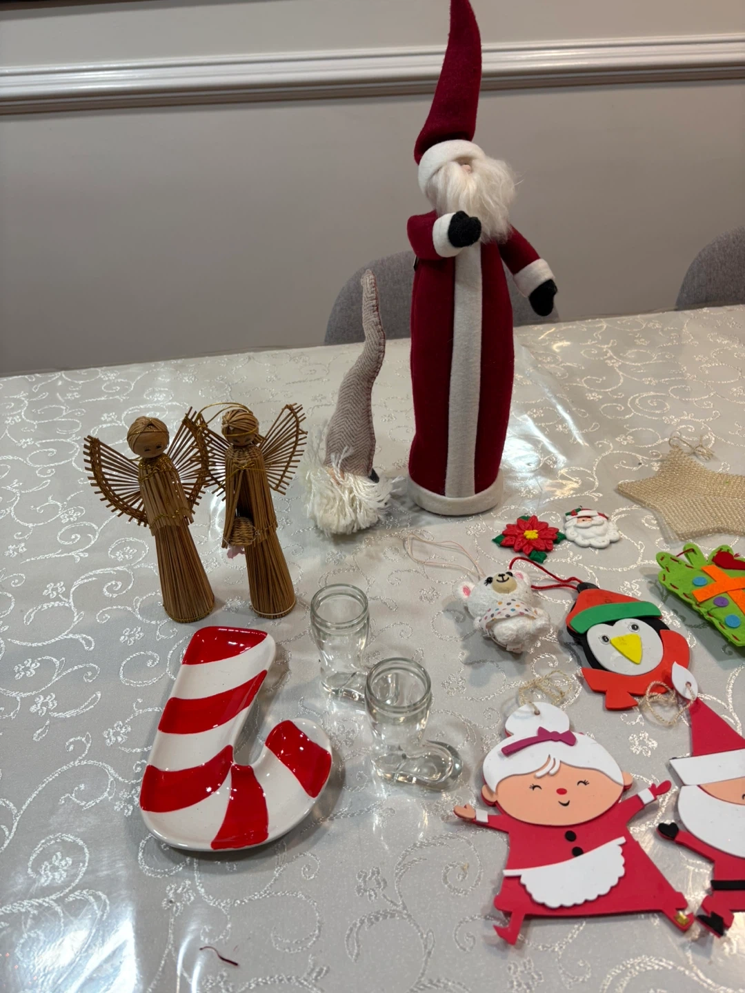 A variety of Christmas decorations are up for grabs! There are several ornaments, a wreath, and a wooden decoration. Perfect for getting into the holiday spirit. A variety of cute Christmas ornaments and decorations! Includes felt ornaments, a wooden "Merry Christmas" sign, and a festive wreath. Perfect for adding some holiday cheer to your home .