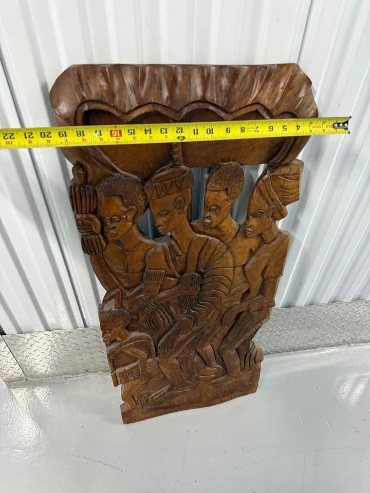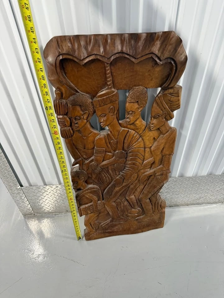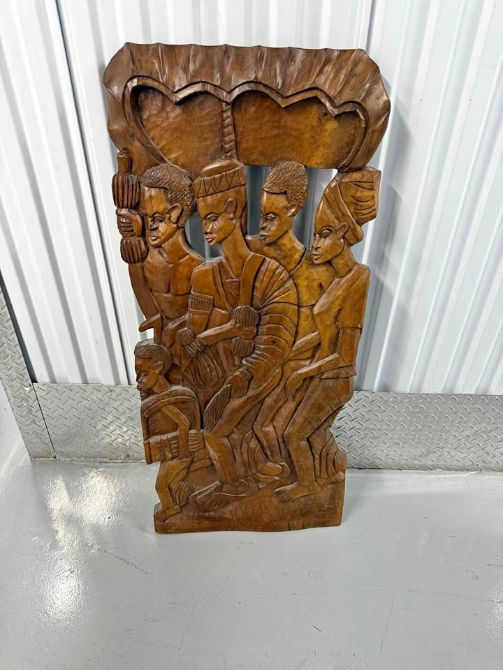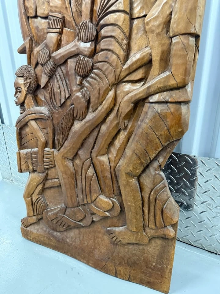 Beautiful large hand-carved African hardwood wall panel featuring a detailed group of people. Solid wood, carved from a single piece. Has great texture, warm color, and tons of character.