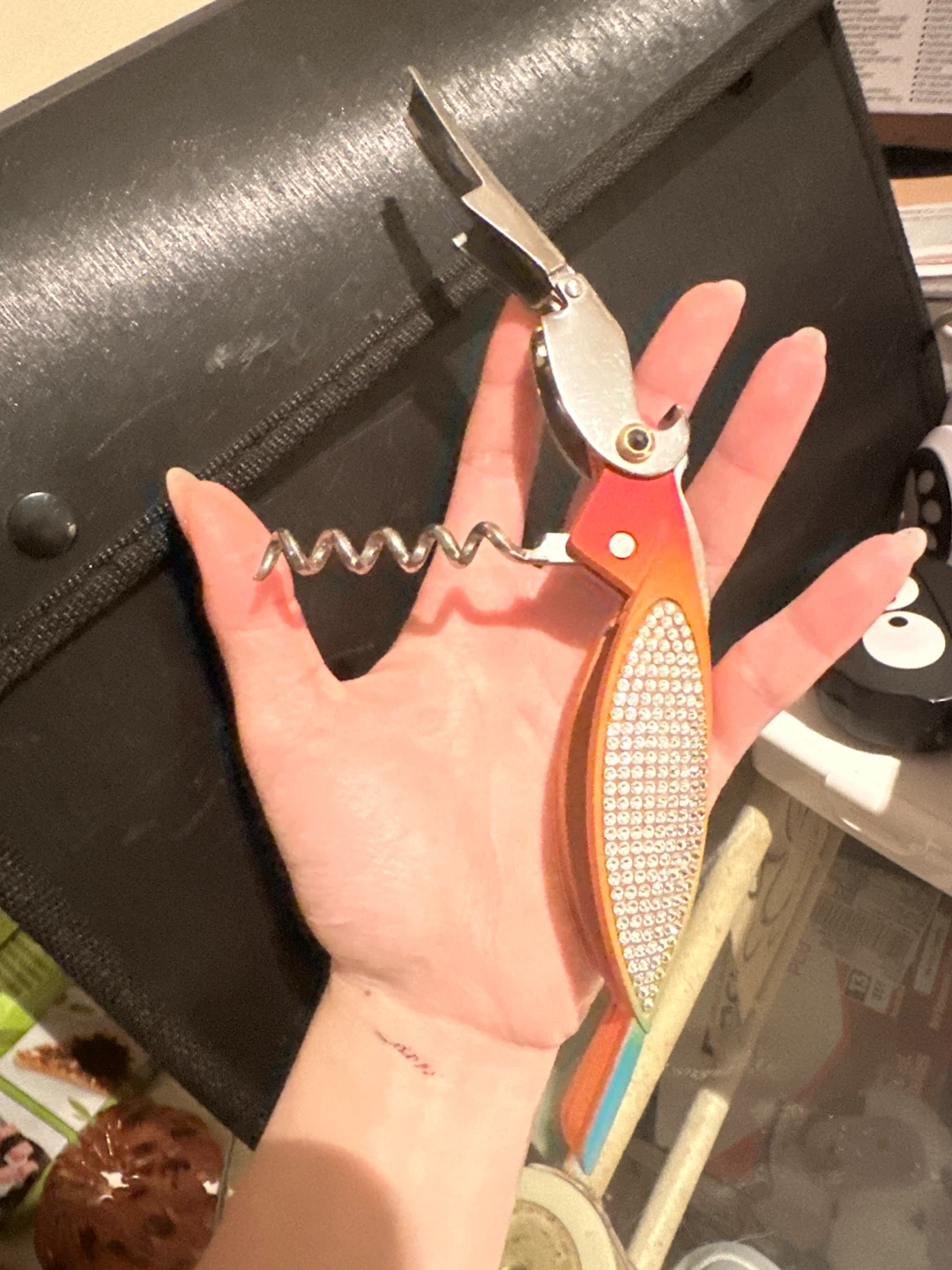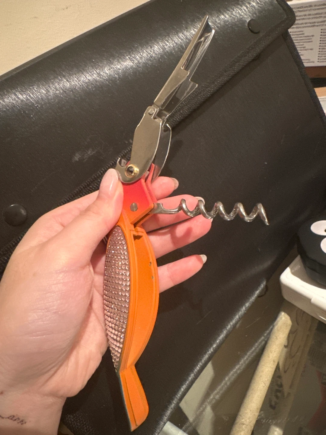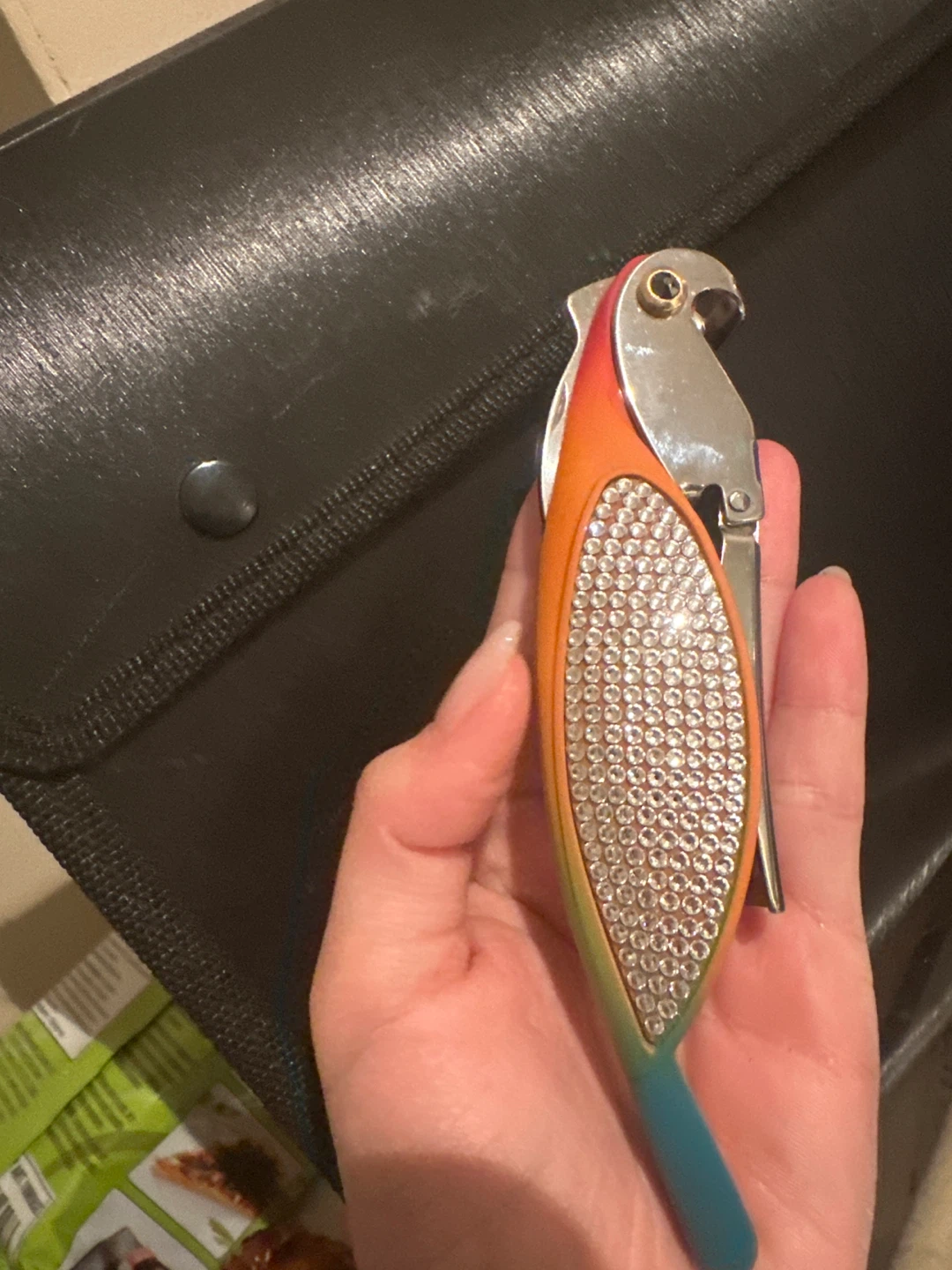 Here's a fun parrot-shaped wine opener! It has a colourful design with a rhinestone-studded body and a silver-toned head. Perfect for adding a bit of whimsy to your next gathering!