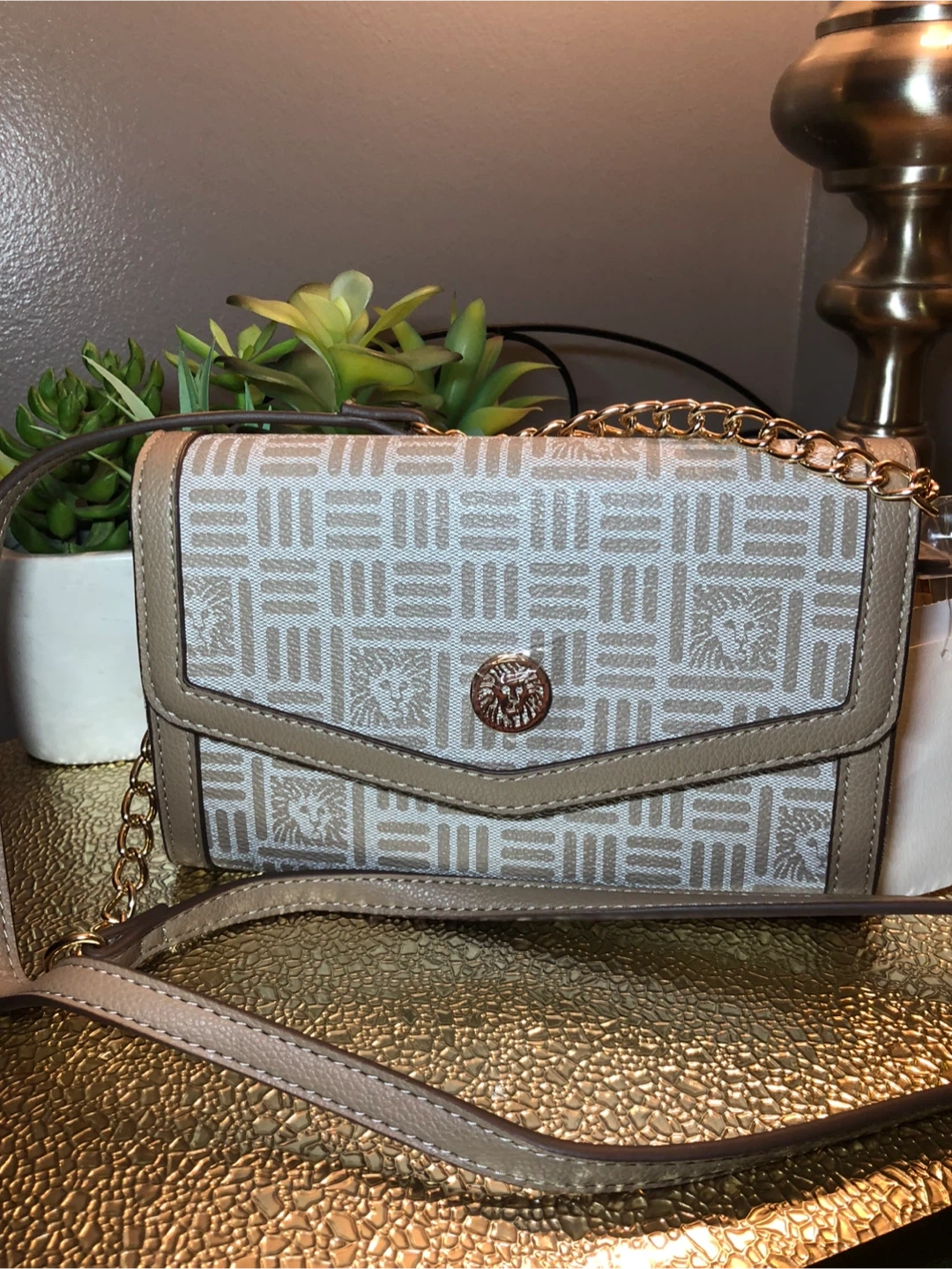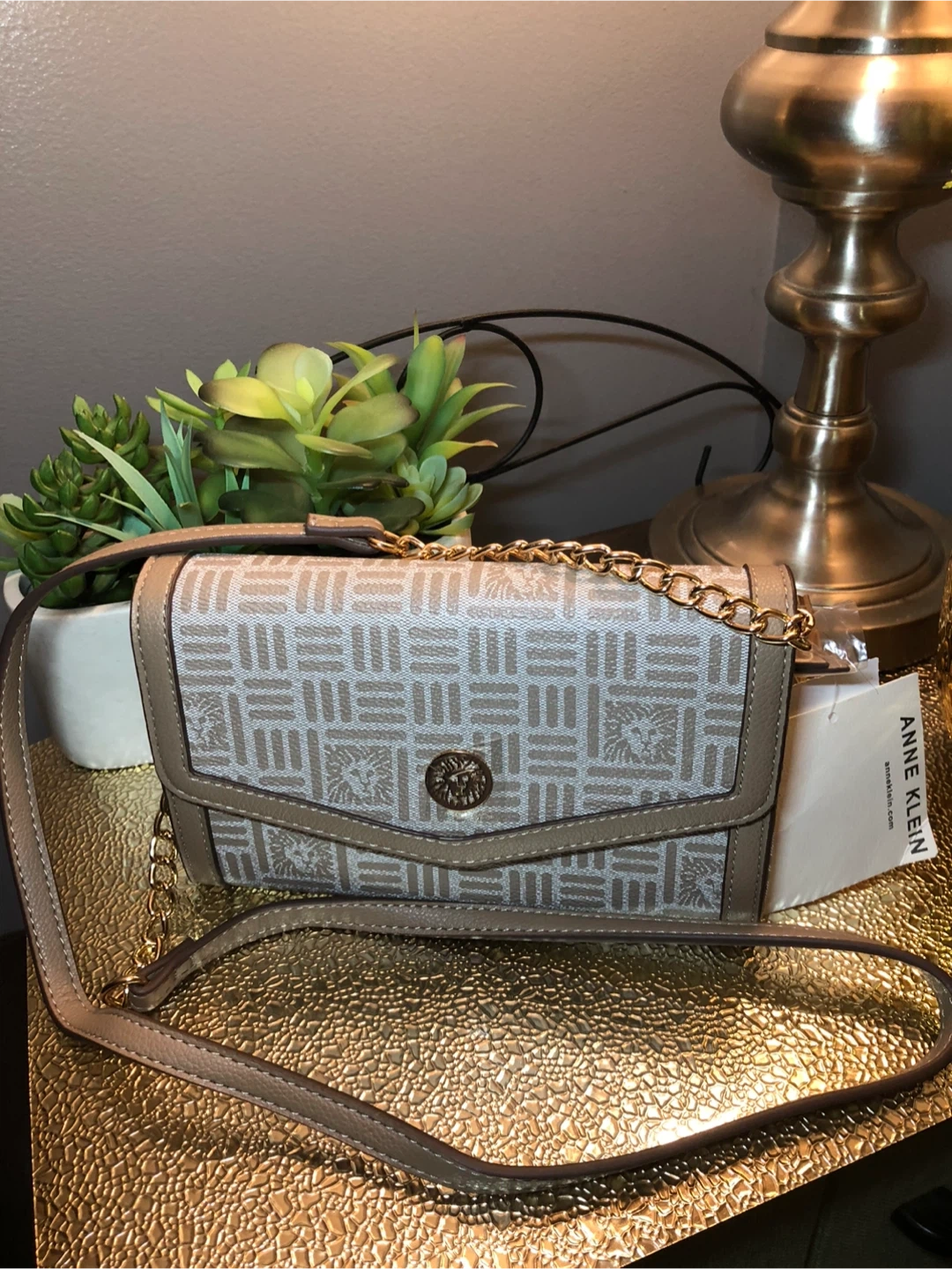 This is an Anne Klein crossbody bag. It has a beige and white pattern with a gold chain strap. It's in great condition and ready for a new owner!
