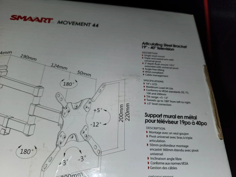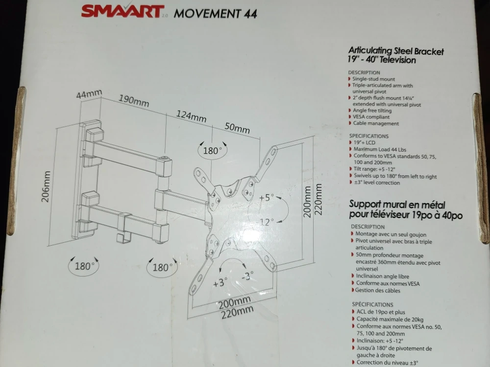 It supports a maximum load of 44 lbs and conforms to VESA standards 50, 75, 100, and 200mm. The tilt range is +5-12° and it swivels up to 180° from left to right with ±3° level correction. Comes with the box!