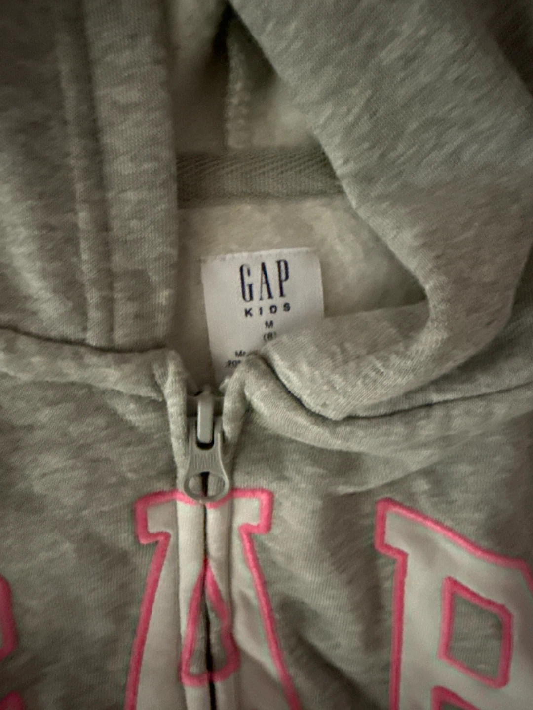 Selling a gently used GAP Kids hoodie in size M. It's a cute grey color with a pink and white GAP logo. Perfect for keeping your little one warm and stylish!