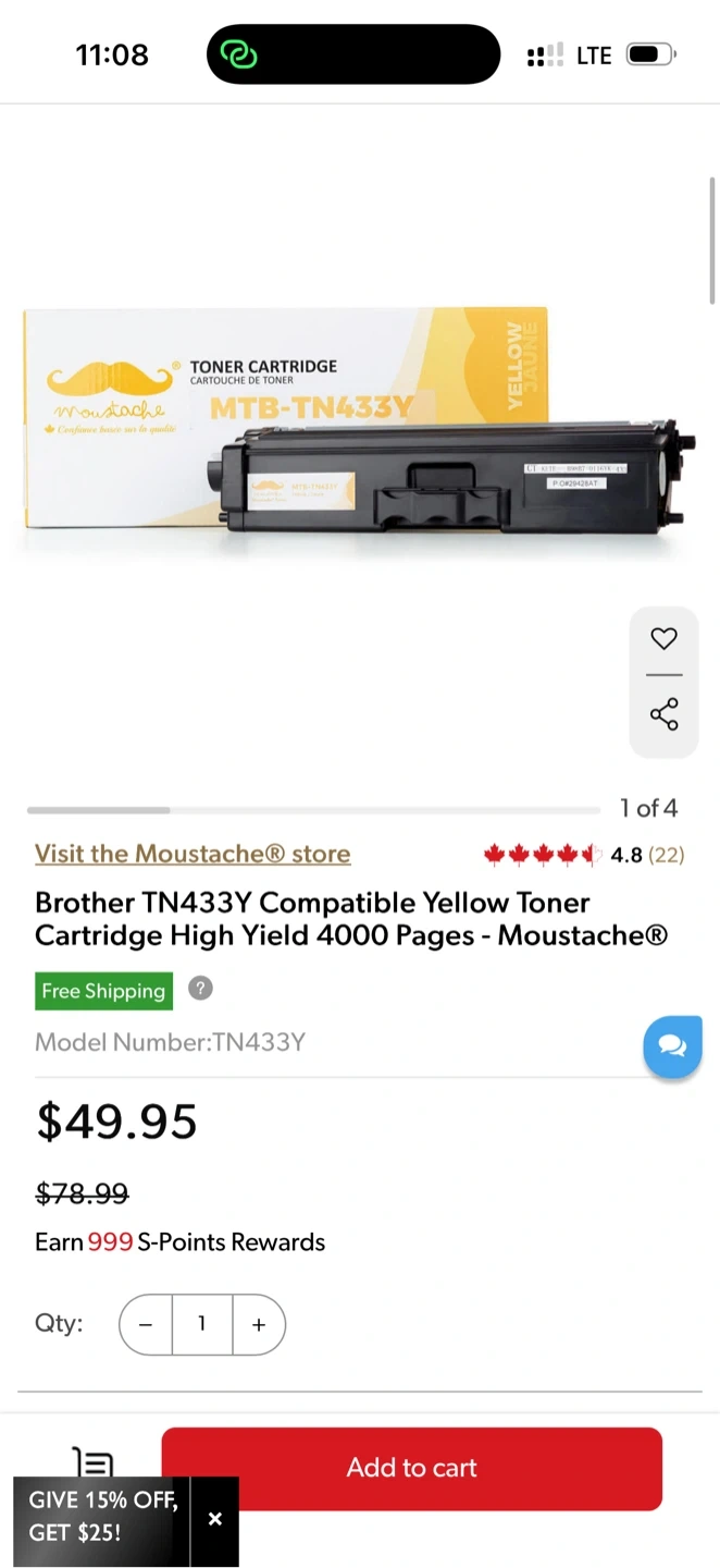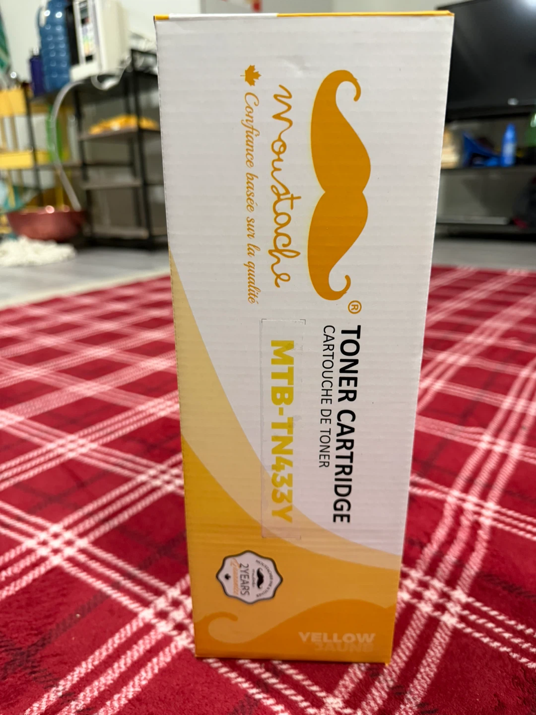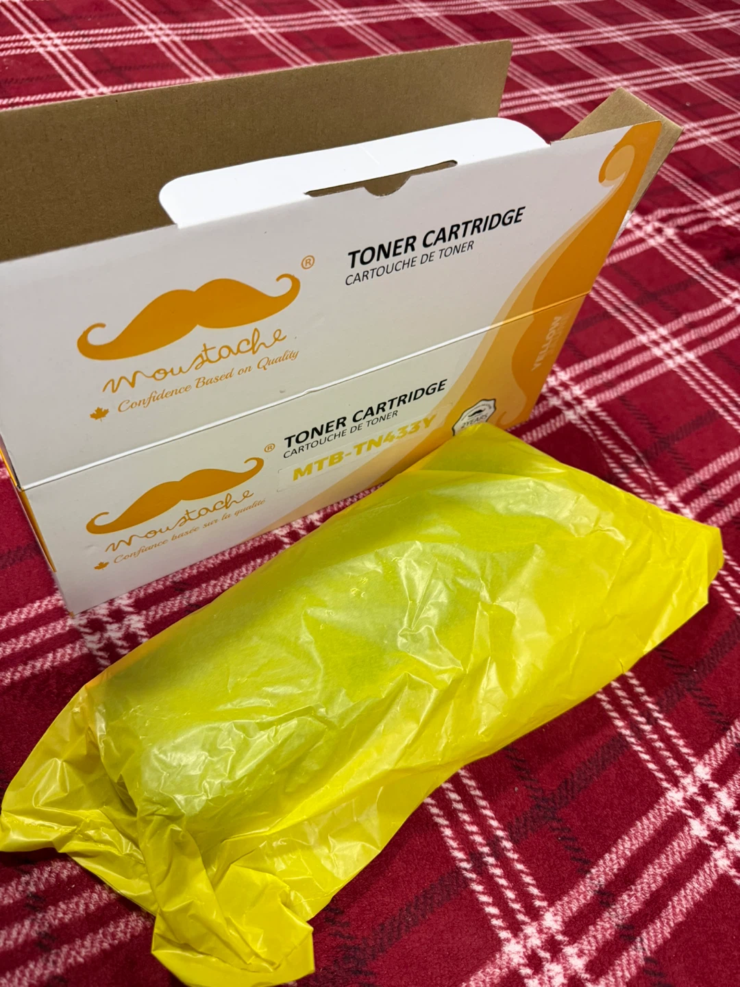 I'm selling a brand new Moustache MTB-TN433Y yellow toner cartridge! It's still sealed in its original packaging. This toner cartridge is compatible with Brother printers and offers high yield, printing up to 4000 pages. Originally bought for $49.95, it's a great deal for anyone needing a reliable toner cartridge!