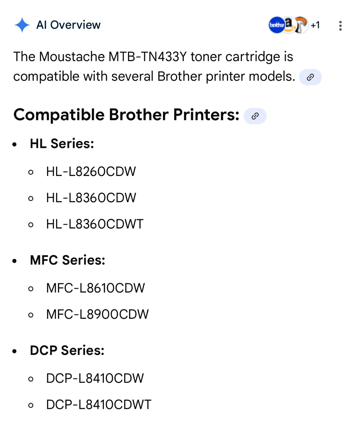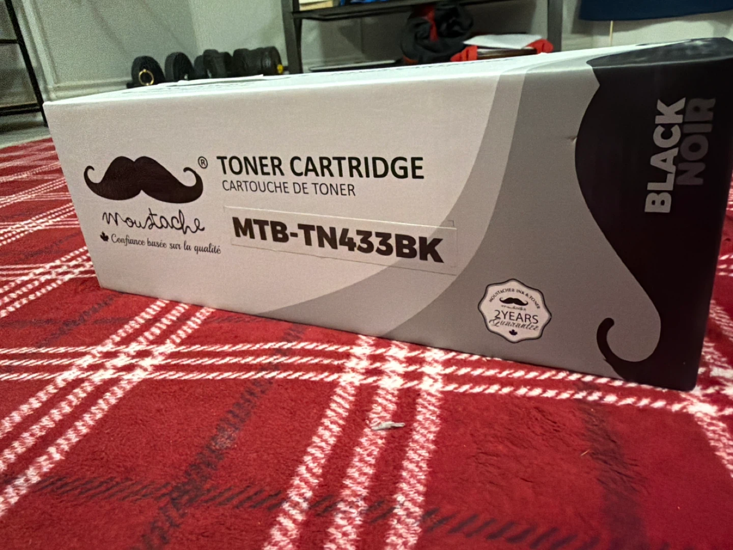 Selling a brand new Moustache MTB-TN433BK black toner cartridge! It's still in its original packaging, ready to go. This toner cartridge is compatible with several Brother printer models, including HL Series (HL-L8260CDW, HL-L8360CDW, HL-L8360CDWT), MFC Series (MFC-L8610CDW, MFC-L8900CDW), and DCP Series (DCP-L8410CDW, DCP-L8410CDWT).