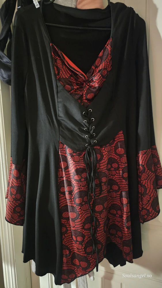 This is a really cool black dress with red skull lace detailing. It has a flattering V-neck and a lace-up front. The sleeves are long and flowy. Perfect for a night out or a Halloween party!