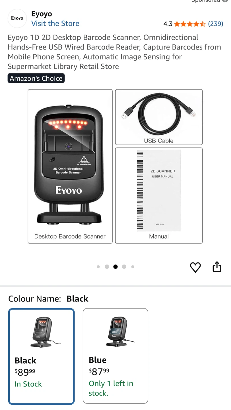 Selling a black Eyoyo 1D 2D desktop barcode scanner. It's an omnidirectional hands-free USB wired barcode reader that can capture barcodes from mobile phone screens. It also features automatic image sensing for supermarket library retail stores. It's in great condition and comes with the USB cable and user manual